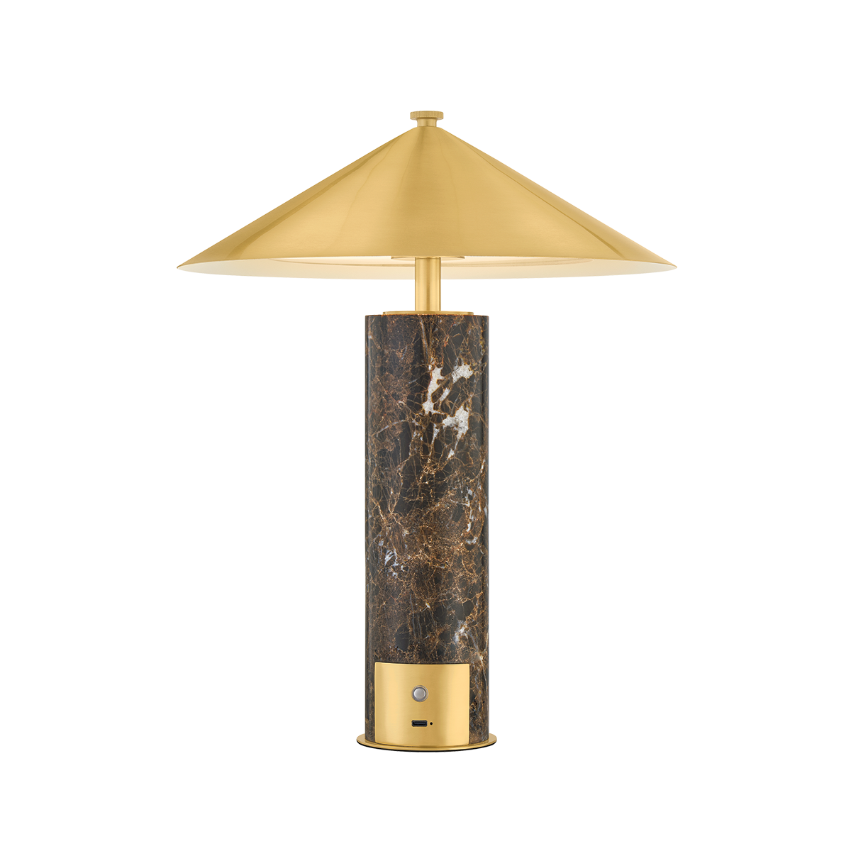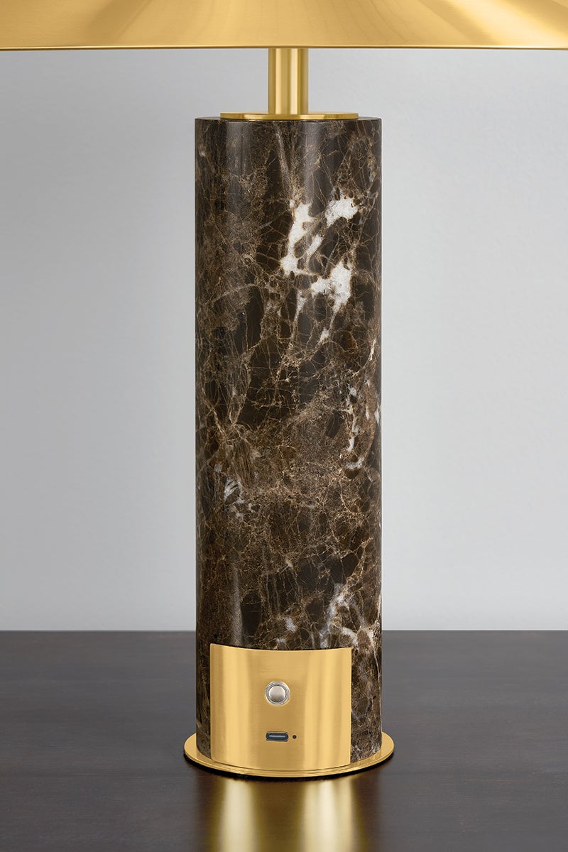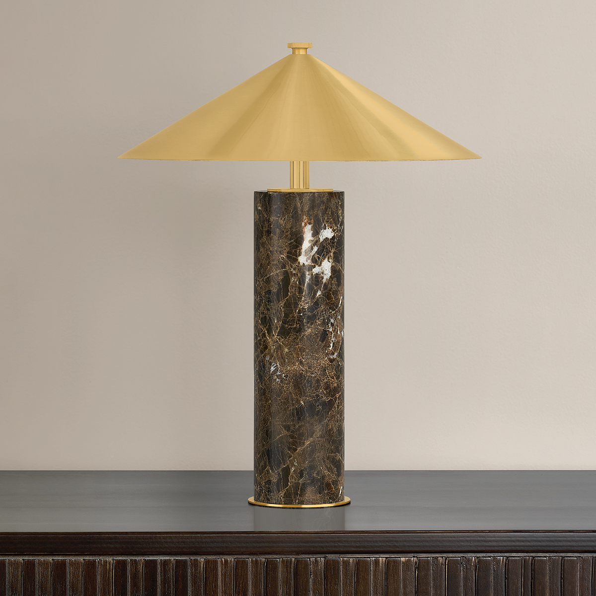 While compact in scale, the Permont table lamp makes a design-forward statement. This LED lamp’s sharply tapered metal shade is finished in Aged Brass with a luxurious honed Emperador marble base. The natural veining of the stone comes to life when illuminated, giving this piece its one-of-a-kind beauty.
