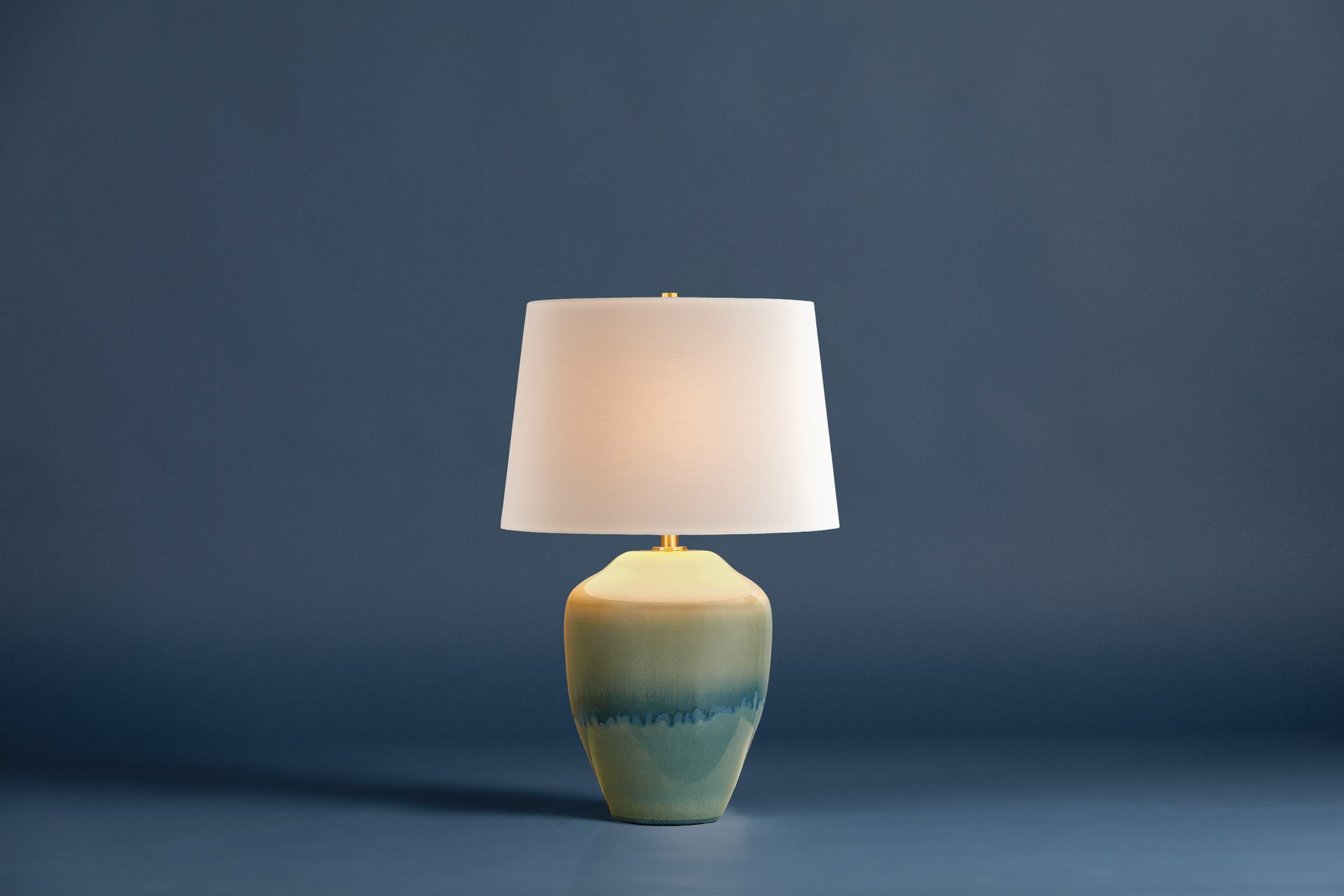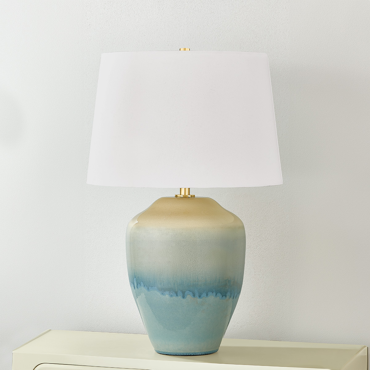 Capturing the colors of sand and sea with a mesmerizing drip effect, this ceramic table lamp is a serene addition to modern interiors. The painterly effect of Montville gives it a fresh-from-the-studio feel, while the glaze reflects light. Topped with a large linen drum shade and finished with Aged Brass metalwork, Montville makes for an artful bedside or living room accent piece.