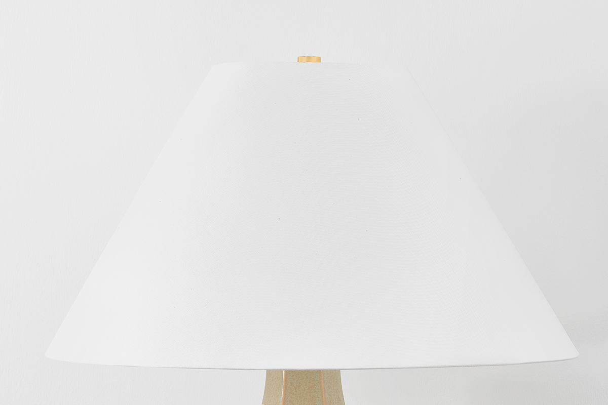 Featuring a faceted gourd-shaped silhouette, the Abescon ceramic lamp brings a creative touch to contemporary spaces. As a unique point of artistry, the facets of the base are highlighted through the natural tendency of the glaze to thin on hard edges. Completing the lamp, a tapered white linen shade mimics the upward gesture of the base.
