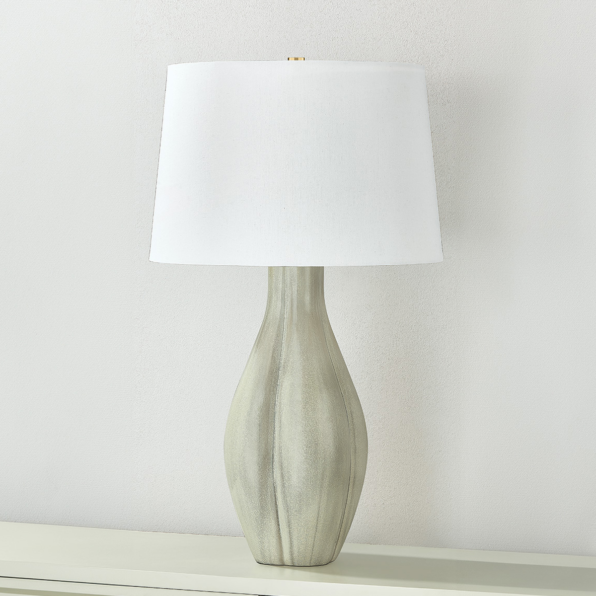 Reminiscent of clouds, three abstract shapes converge to elegantly form the base of this sculptural table lamp. The smooth ceramic finish gives this voluminous lamp a comforting feel that results in a sense of serenity wherever it is placed. A large linen drum shade balances the perfect proportions of Galloway.