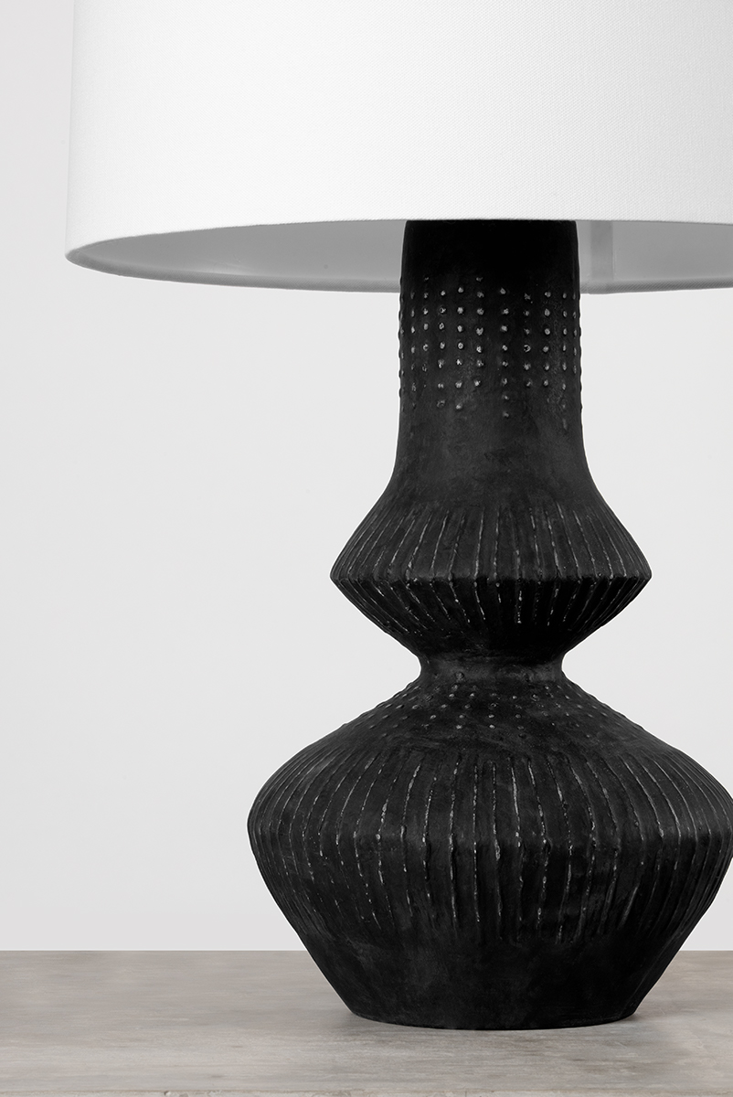 A characterful black ceramic lamp that feels warm and global. The tapered natural linen shade offsets the earthy surface of the ceramic body with sharp angularity. The deep charcoal and textural appearance makes it well-suited to contemporary interiors.
