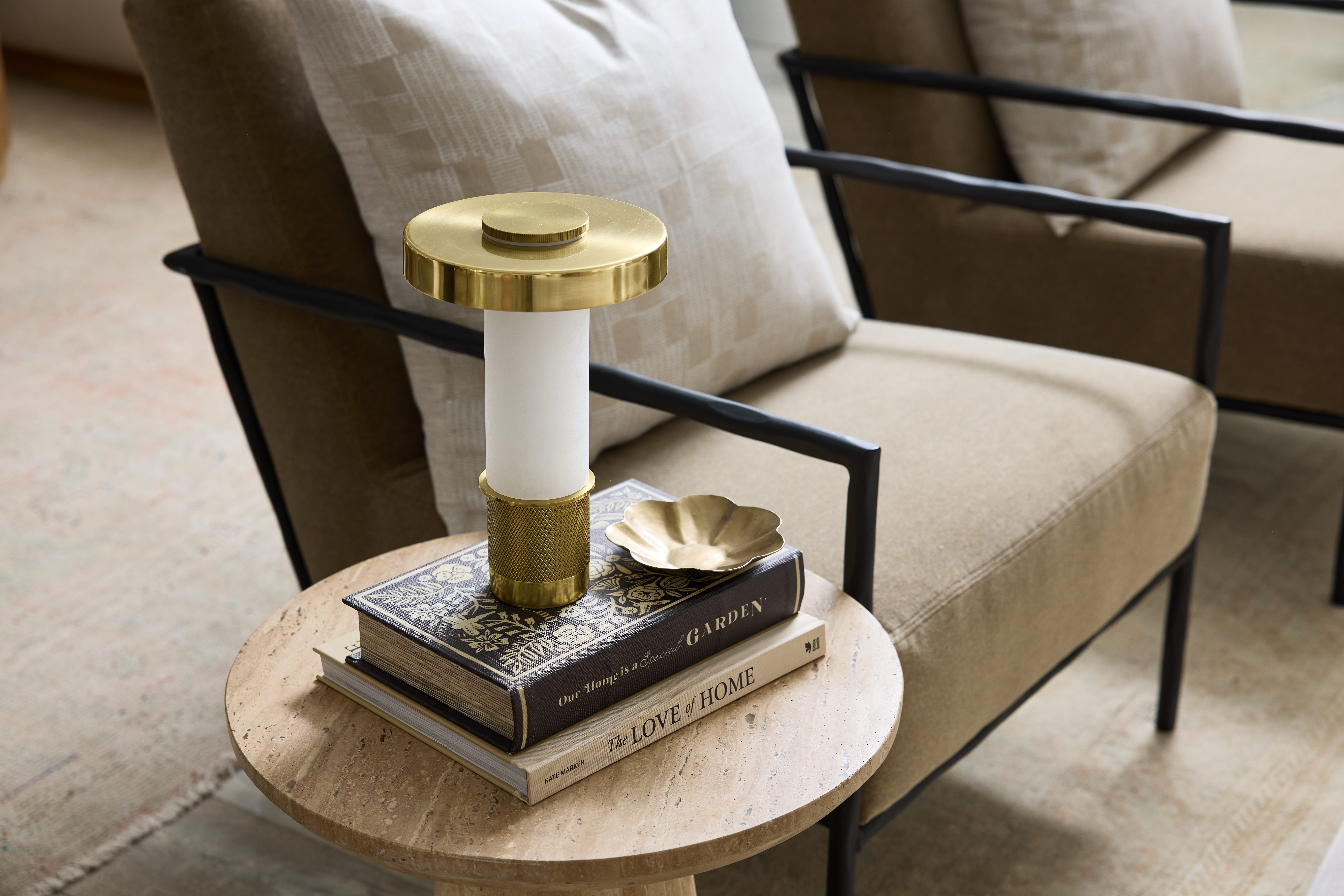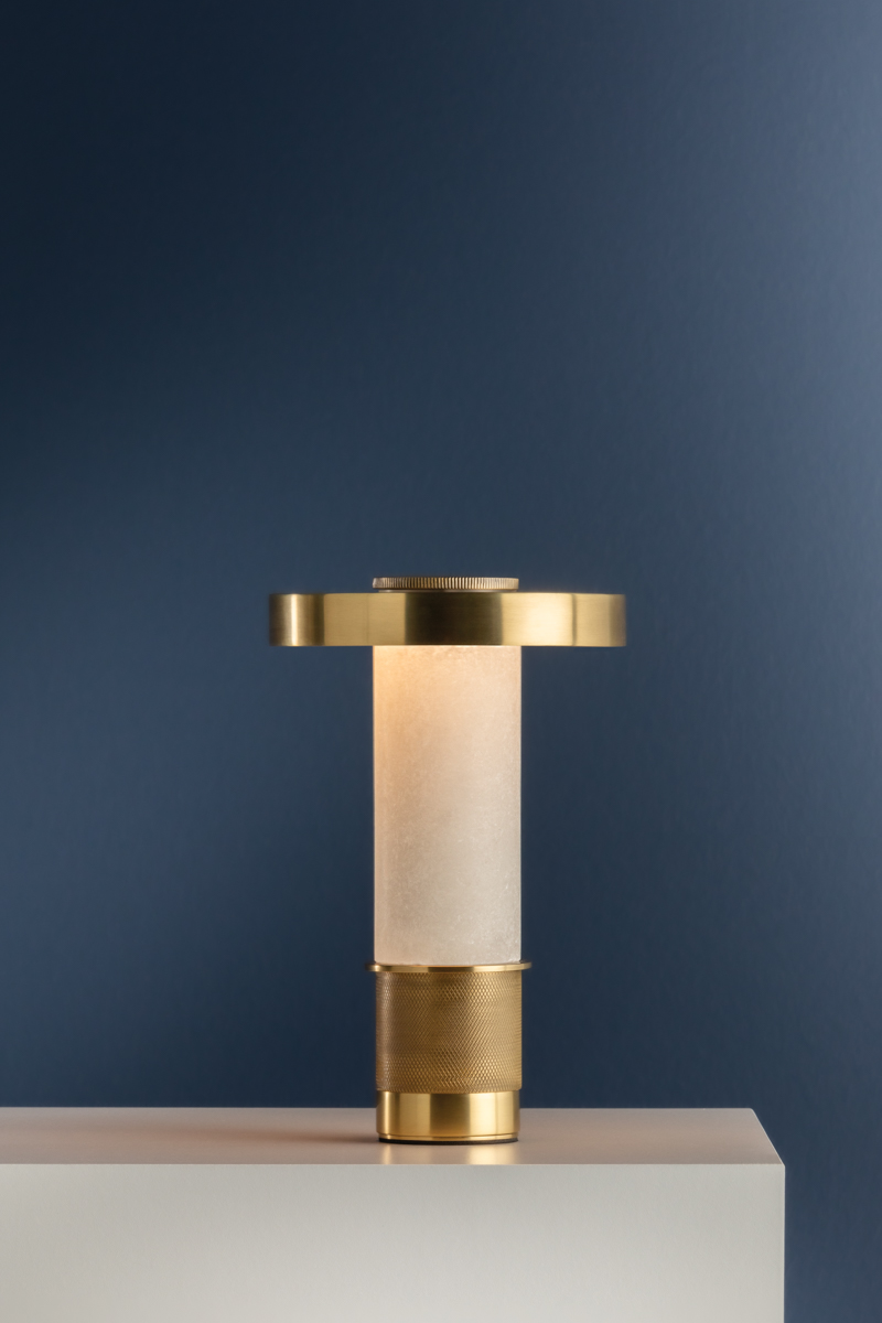 Petite and portable, the Sefton table lamp exudes architectural finesse. This dimmable accent lamp combines an exquisite alabaster tube with a machined metalwork base for a high style statement. The perfectly cylindrical shade, finished in reflective Aged Brass, completes the dynamic design. The battery life of Sefton is dependent on the brightness level set by the user, and it recharges in 3.5 hours. This mini lamp can also be used while charging.