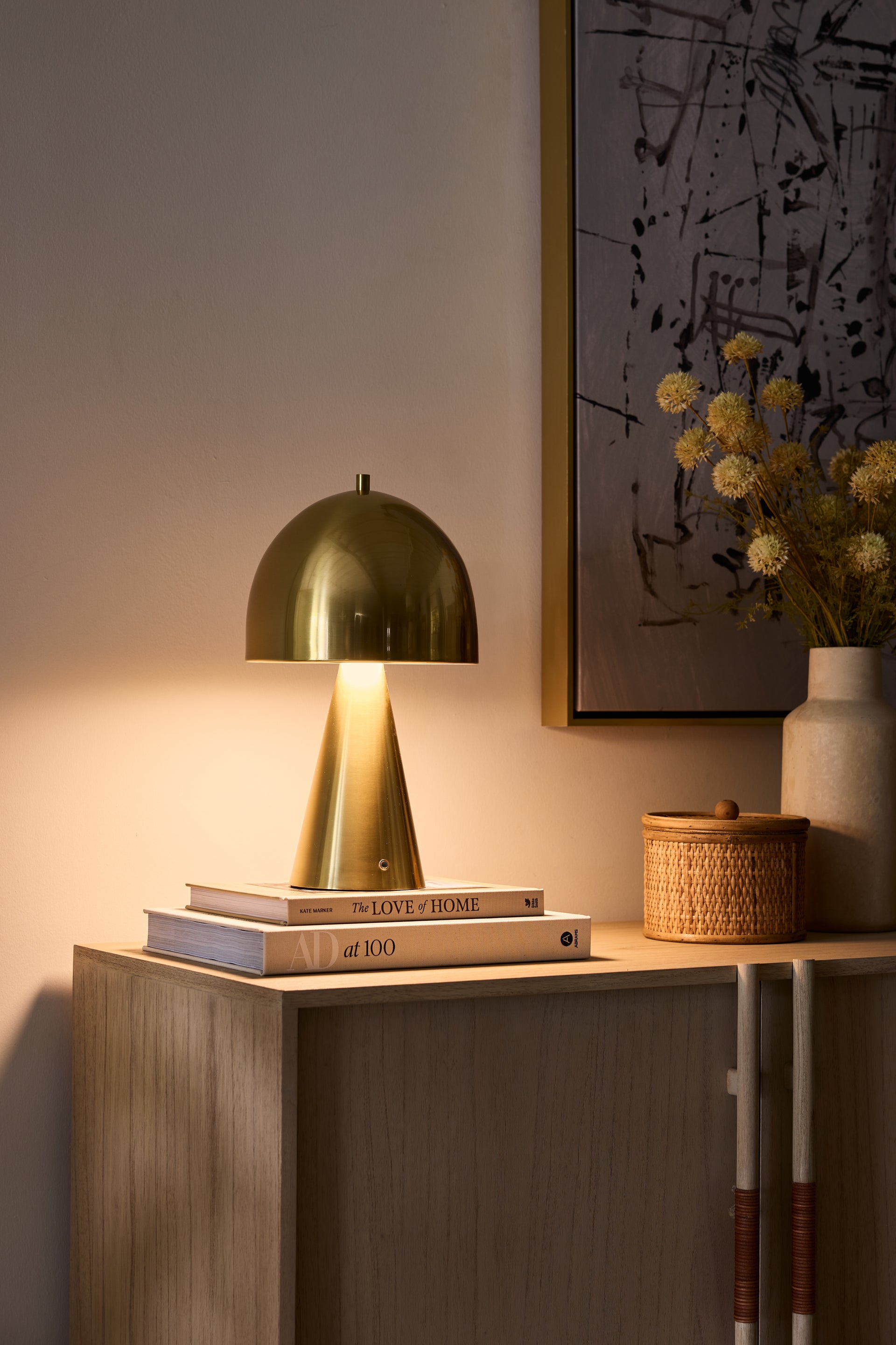 The contrast between the oblong domed shade and the conical base of Hopkinton creates a striking geometric design. Whether this petite accent lamp is finished in Aged Brass or Distressed Bronze, the on-trend mushroom silhouette adds a dose of personality. Its integrated rechargeable LED light source ensures lasting functionality. The battery life of Hopkinton is dependent on the brightness level set by the user, and it recharges in 3.5 hours. This dimmable lamp can also be used while charging.