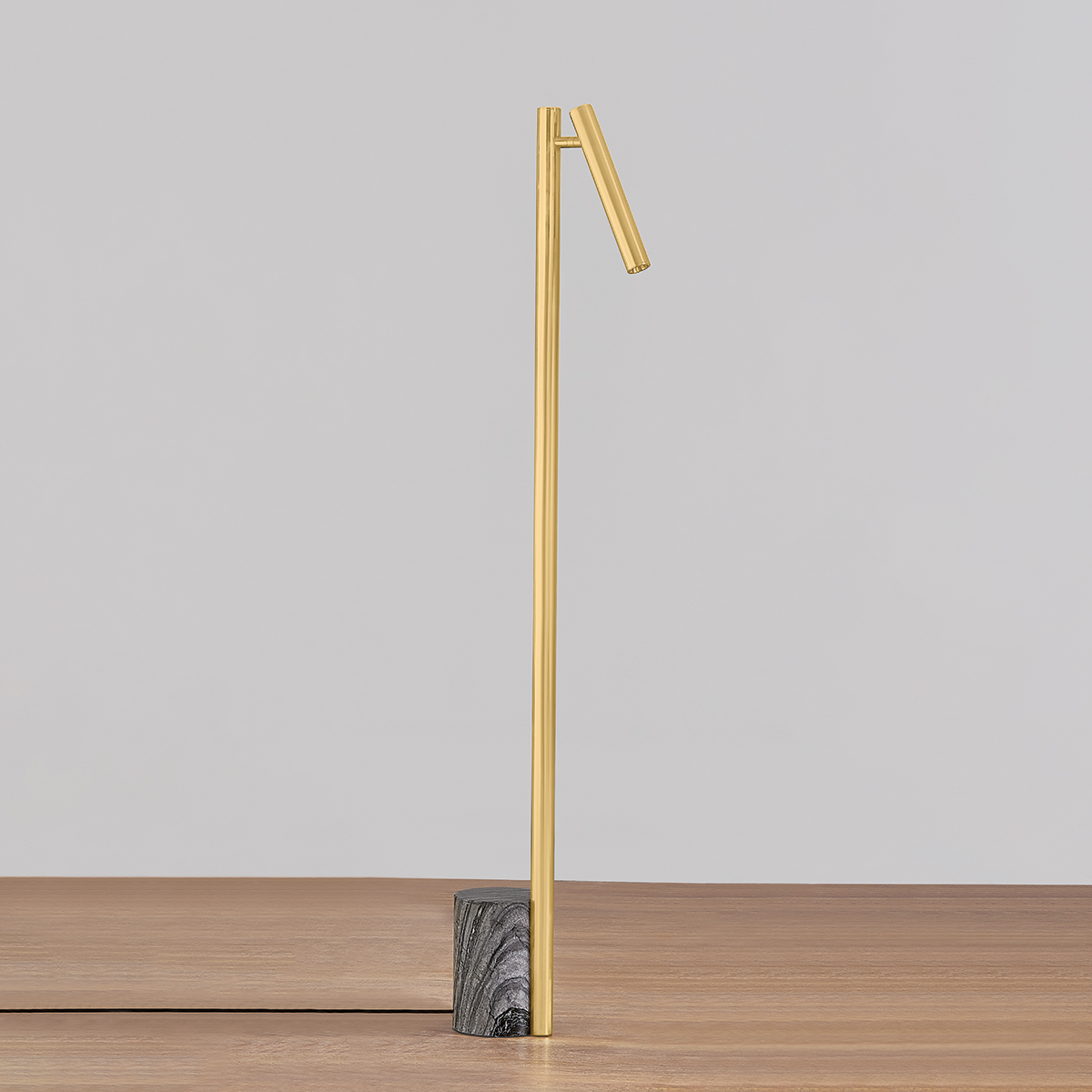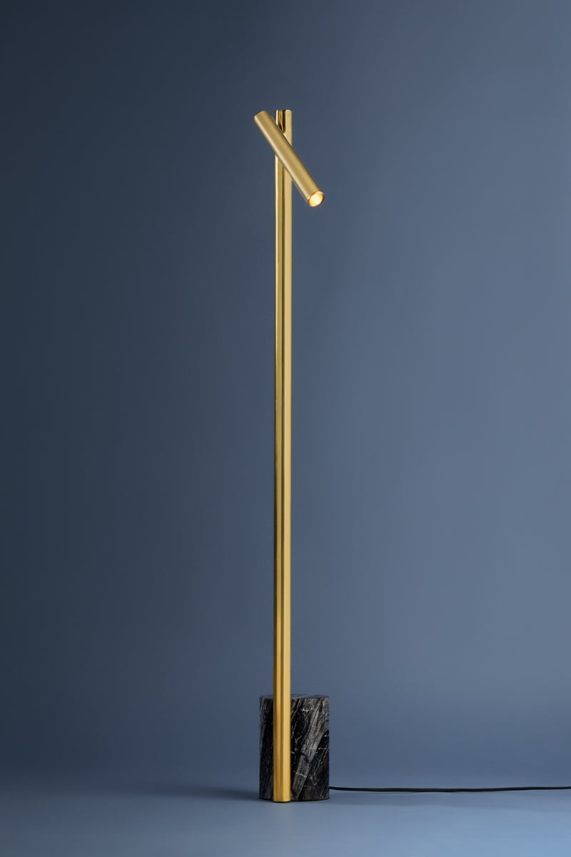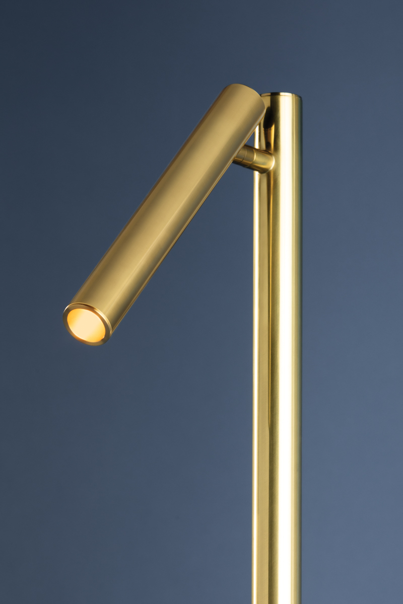 Incorporating CSL’s innovative ‘Whisper’ technology, Circleville cuts a sleek figure in Aged Brass. While it might read as industrial, the elongated tube forms lean towards modernist aesthetics. The articulating shade allows precise control to create a powerful spotlight where needed. Available as a sconce and floor lamp.