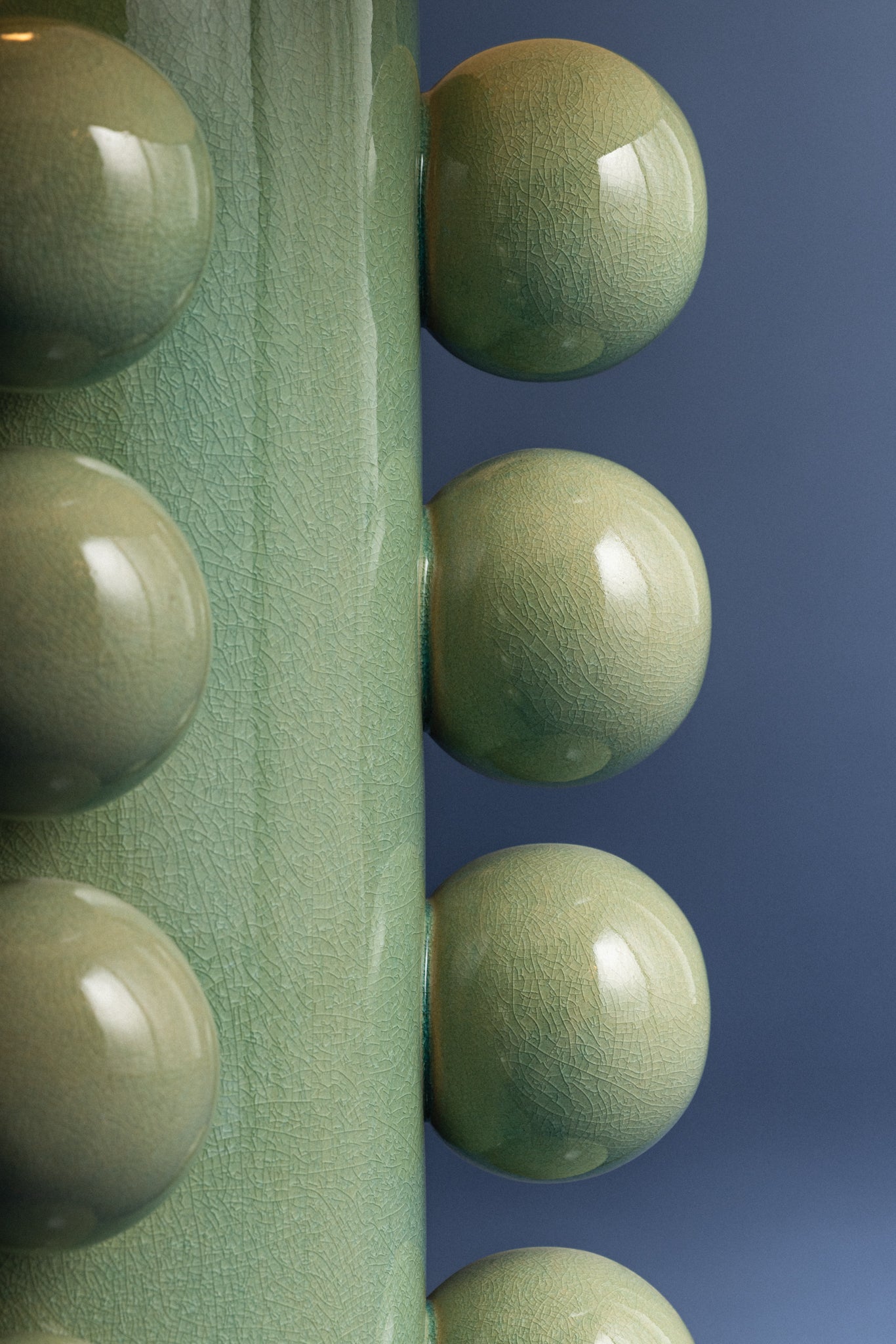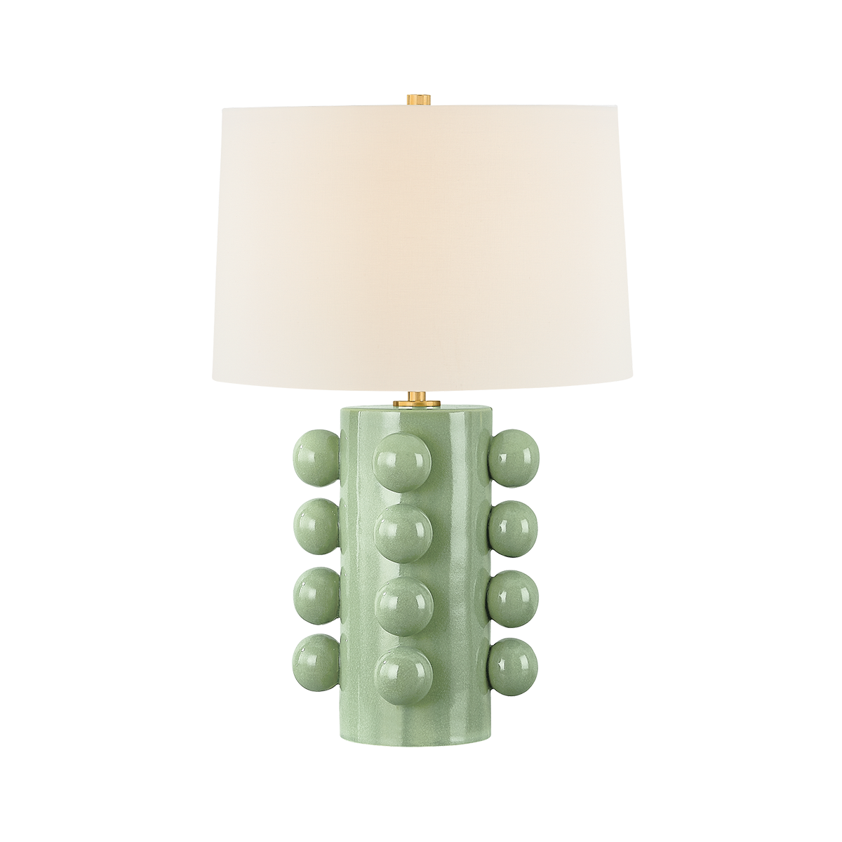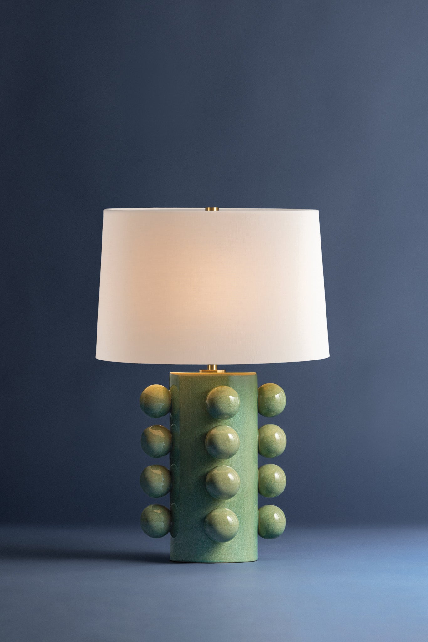 The playful, maximalist design of Roselle brings a splash of style to a table or console. Featuring a series of spherical bobbles swelling out in four directions, the smooth ceramic base is finished in a funky ceramic moss crackle glaze. A bright white linen drum shade complements the cylindrical form, balancing the lamp's whimsical energy with a clean touch.