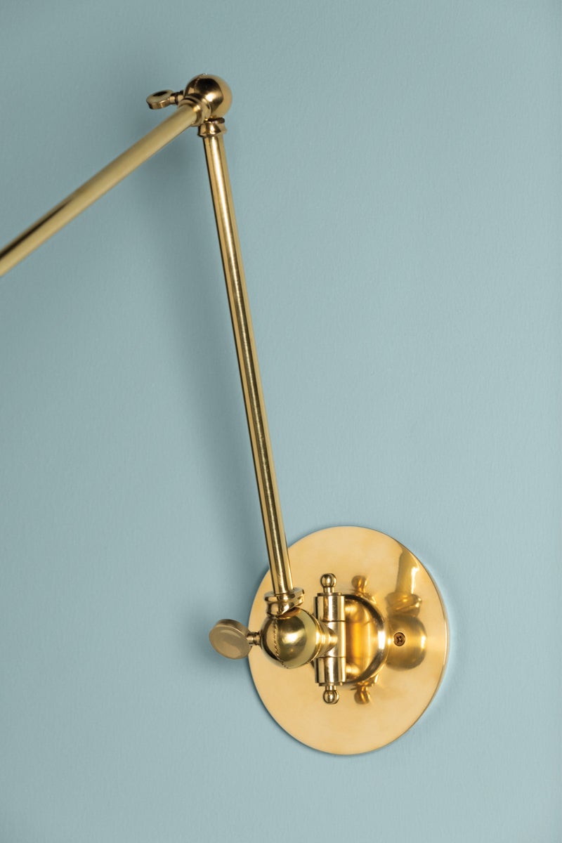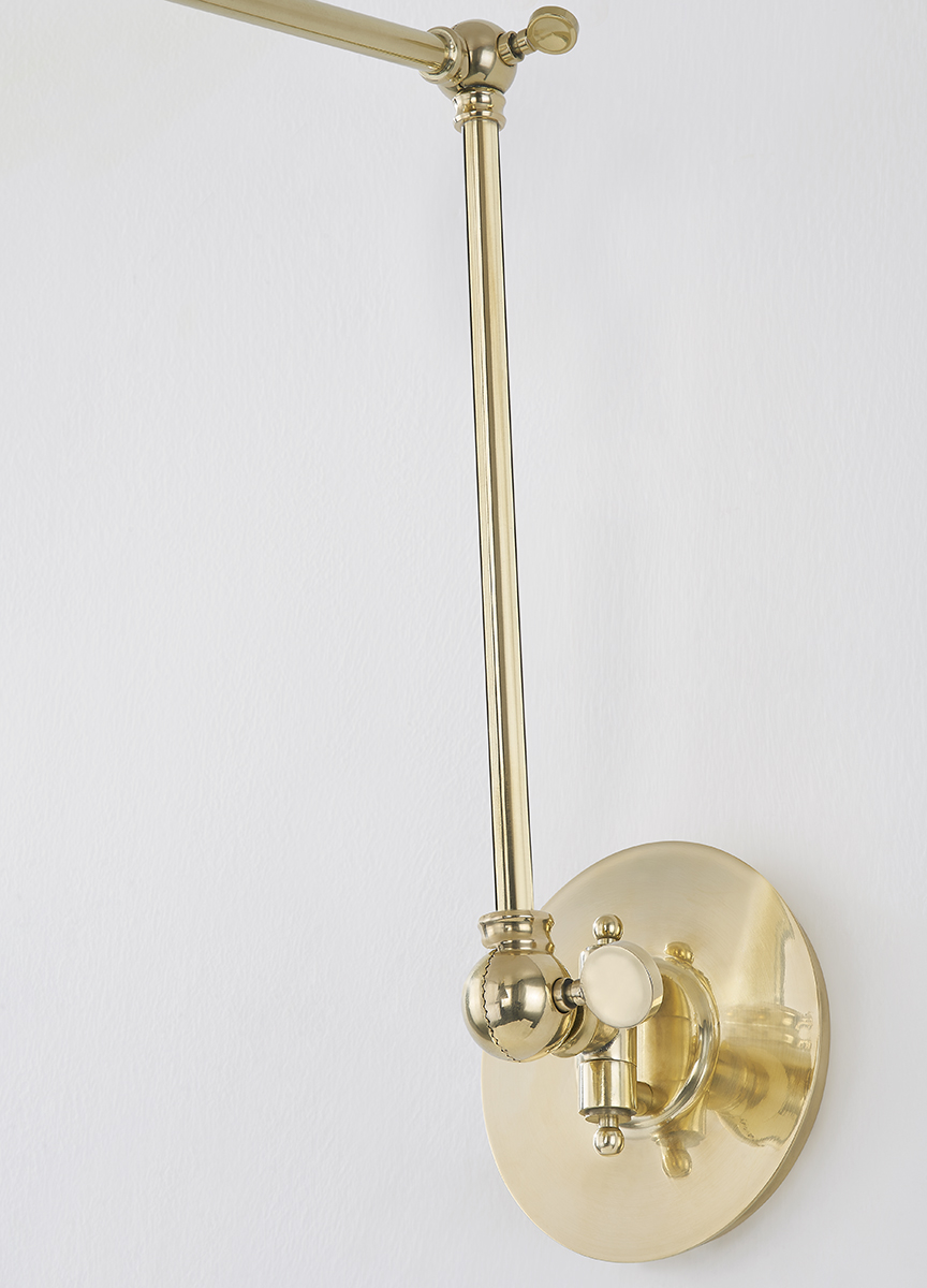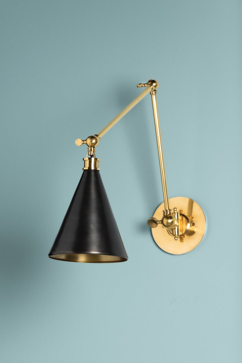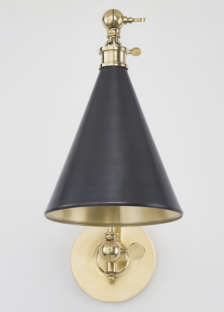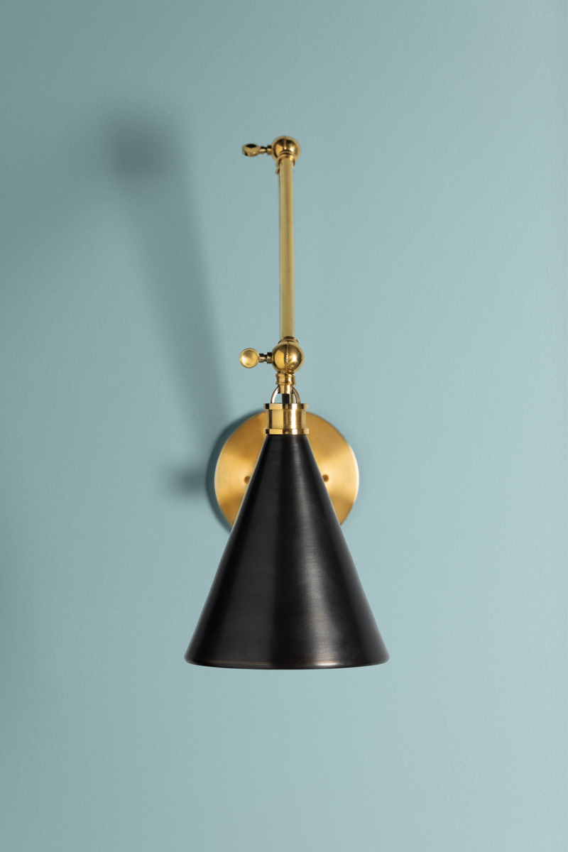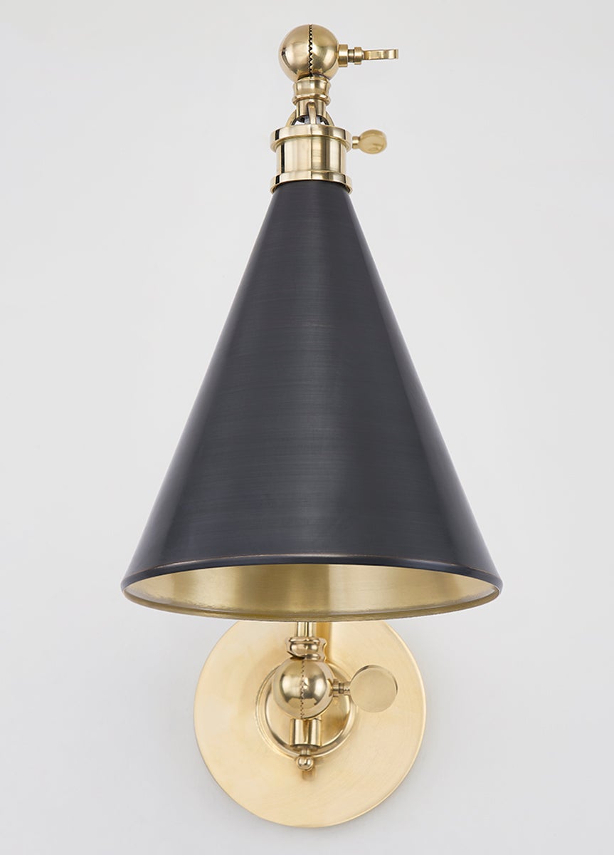 Osterley's simple, yet striking cone silhouette makes it both elegant and useable. The shade's Aged Brass inside contrasts beautifully with the Distressed Bronze outside. Hang the pendant in multiples over kitchen islands, dining tables and down hallways, or use alone to light a smaller space. Both sconces articulate making them ideal bedside or in a cozy reading nook. Part of our Mark D. Sikes collection.