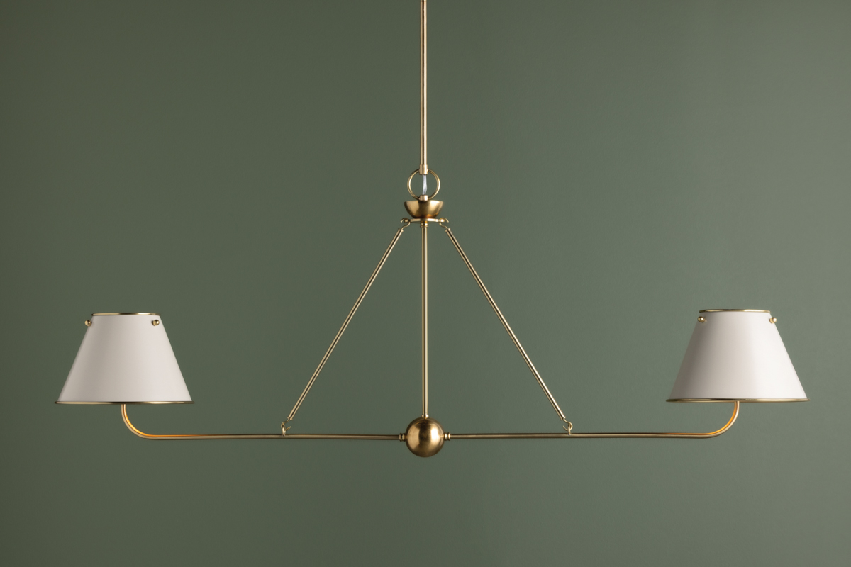 The Burghley family channels a tailored aesthetic with clean lines and sleek metal shades. Featuring Mark D. Sikes’ signature brass ball detail as well as stylish bolts securing the shades, Burghley makes heritage-inspired silhouettes feel fresh. In either Aged Brass and Off White or Aged Brass and Distressed Bronze, the 5-light chandelier and 2-light linear bring a sense of understated refinement to both traditional and modern interiors.