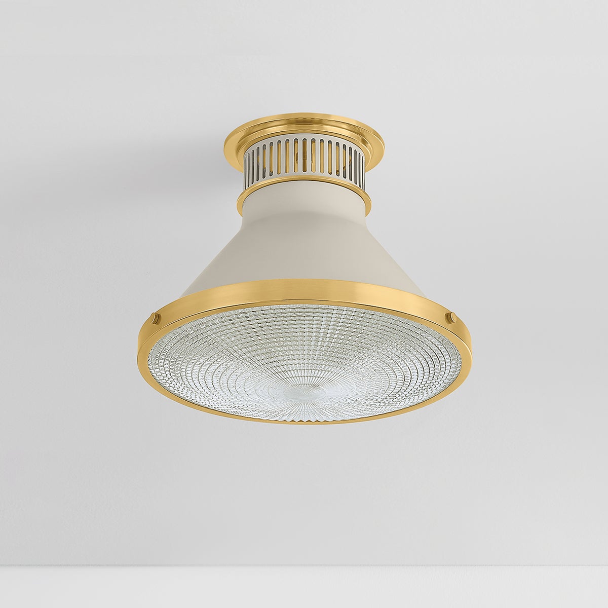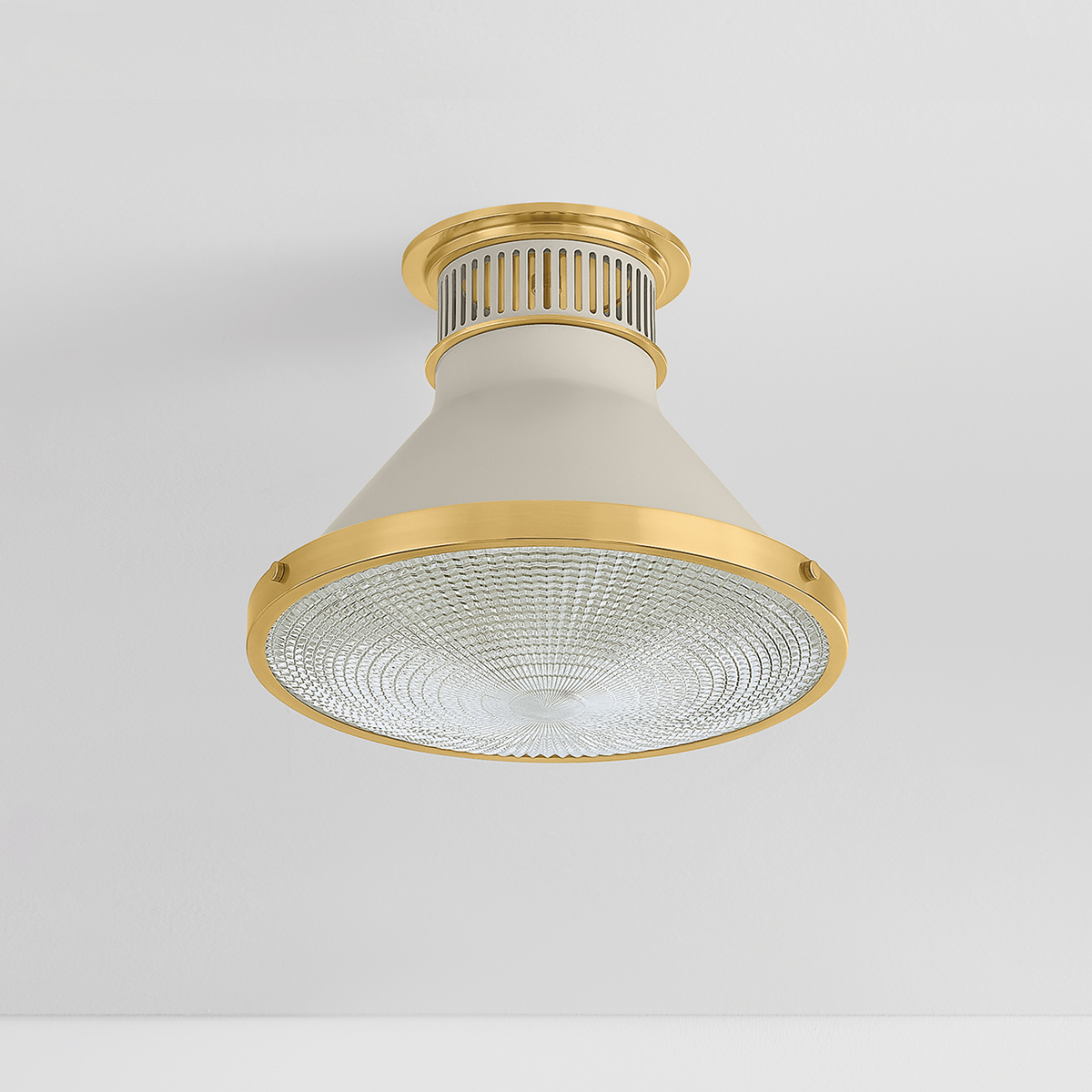 The Highclere family blends industrial and classic elements to create a modern, elevated basic. Etched for added texture, the clear optic glass shade creates a beautiful diffusion of light while the bell-shaped silhouette of the shade is accented by Mark D. Sikes' signature brass screw detailing. Highclere is available as a small and large flush mount and a small and large pendant. The three finish options include Aged Brass, Aged Brass and Off-White, and Aged Brass and Soft French Blue.