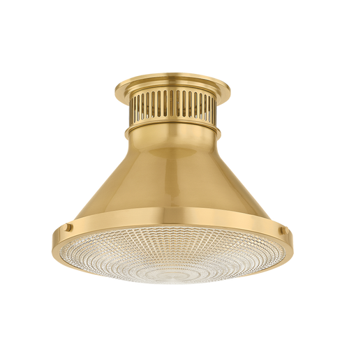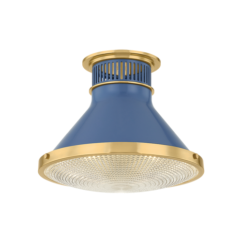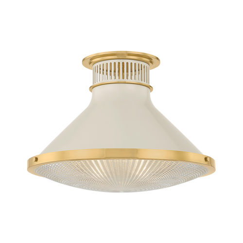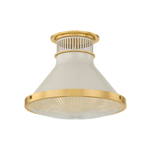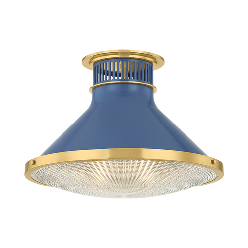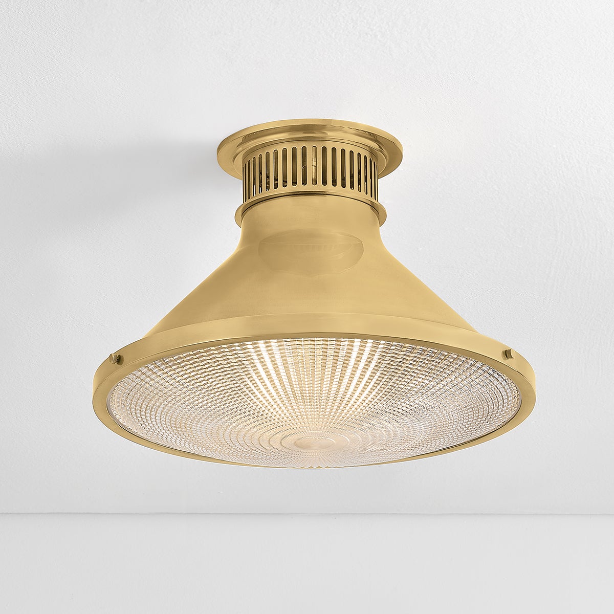 The Highclere family blends industrial and classic elements to create a modern, elevated basic. Etched for added texture, the clear optic glass shade creates a beautiful diffusion of light while the bell-shaped silhouette of the shade is accented by Mark D. Sikes' signature brass screw detailing. Highclere is available as a small and large flush mount and a small and large pendant. The three finish options include Aged Brass, Aged Brass and Off-White, and Aged Brass and Soft French Blue.