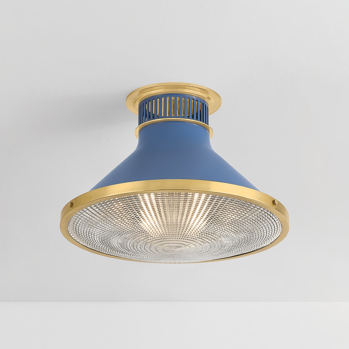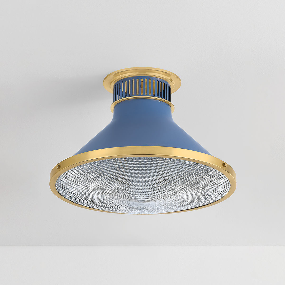 The Highclere family blends industrial and classic elements to create a modern, elevated basic. Etched for added texture, the clear optic glass shade creates a beautiful diffusion of light while the bell-shaped silhouette of the shade is accented by Mark D. Sikes' signature brass screw detailing. Highclere is available as a small and large flush mount and a small and large pendant. The three finish options include Aged Brass, Aged Brass and Off-White, and Aged Brass and Soft French Blue.