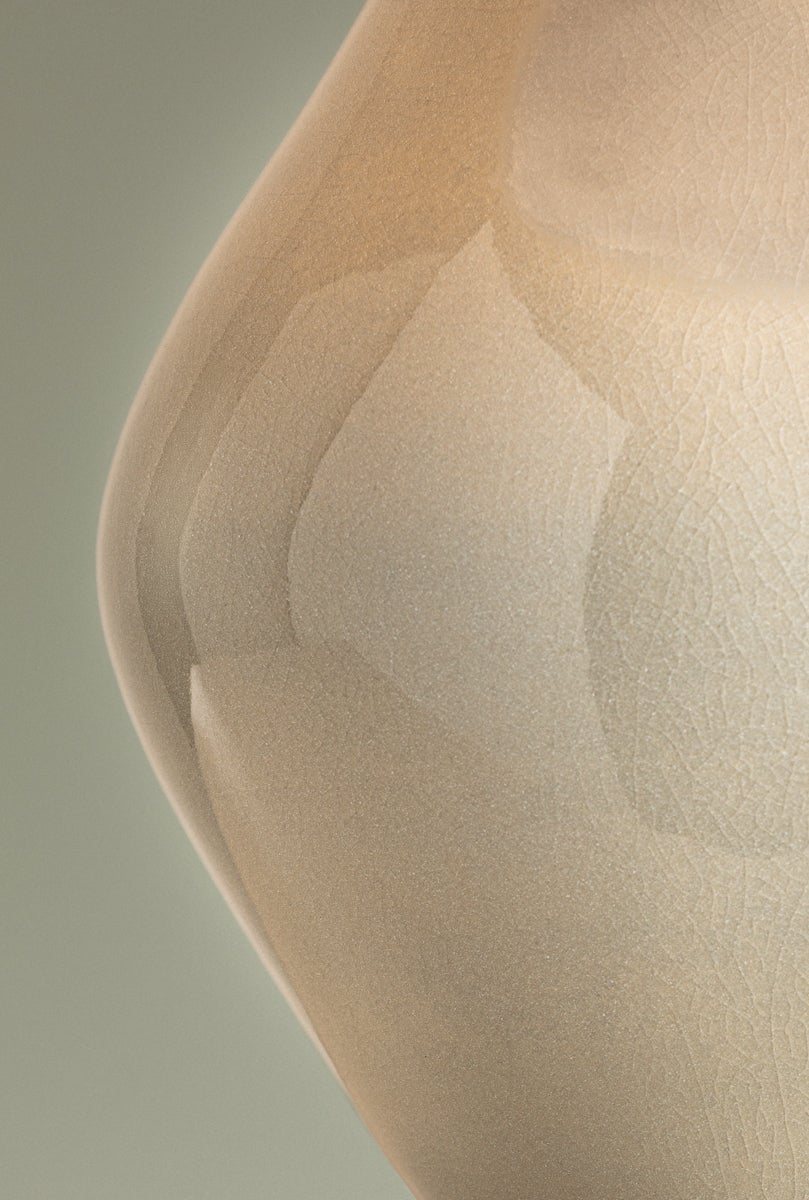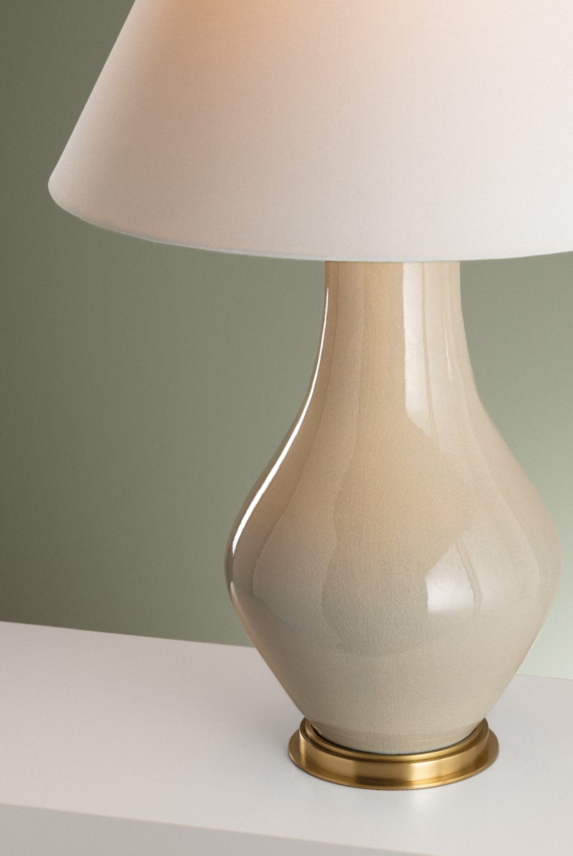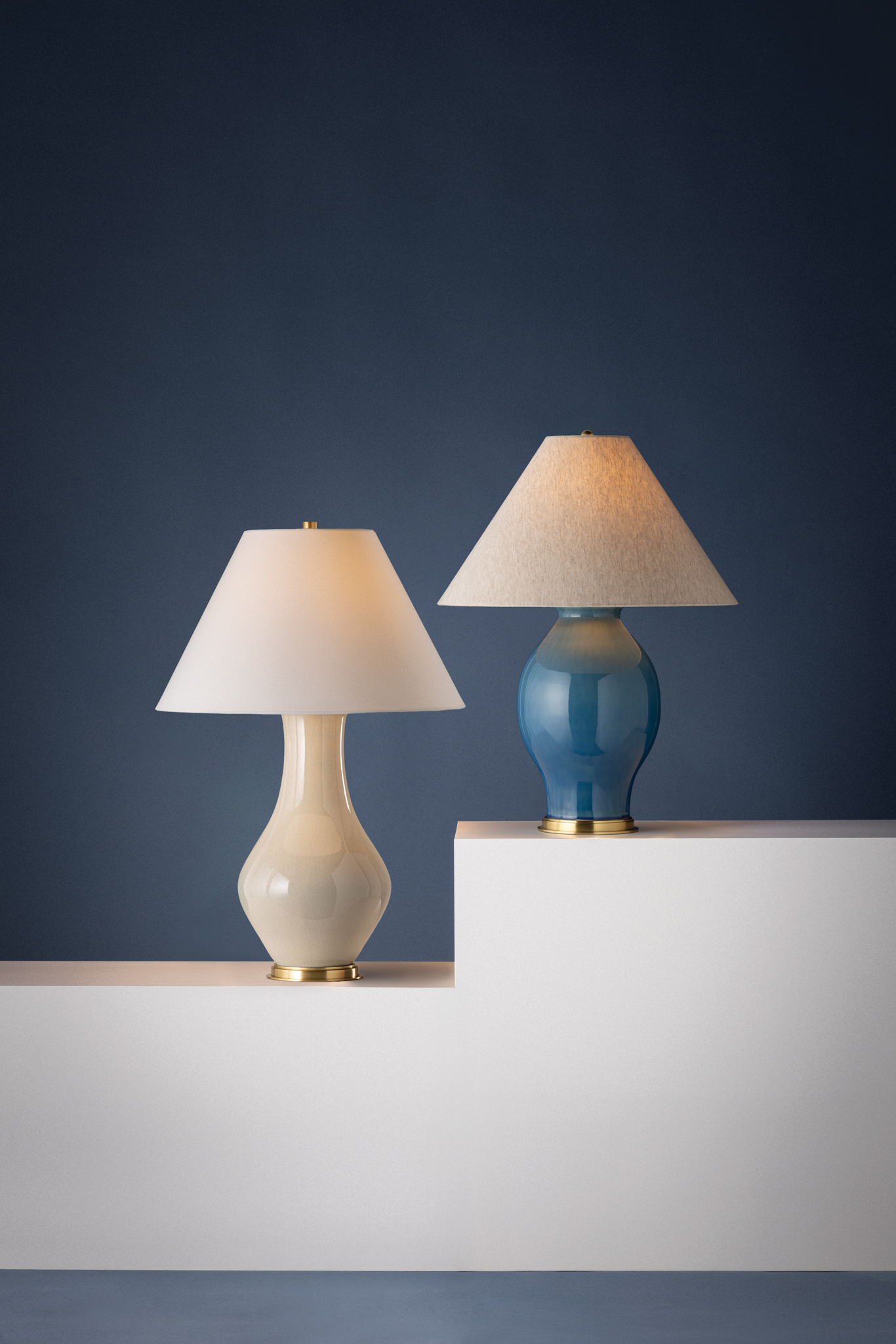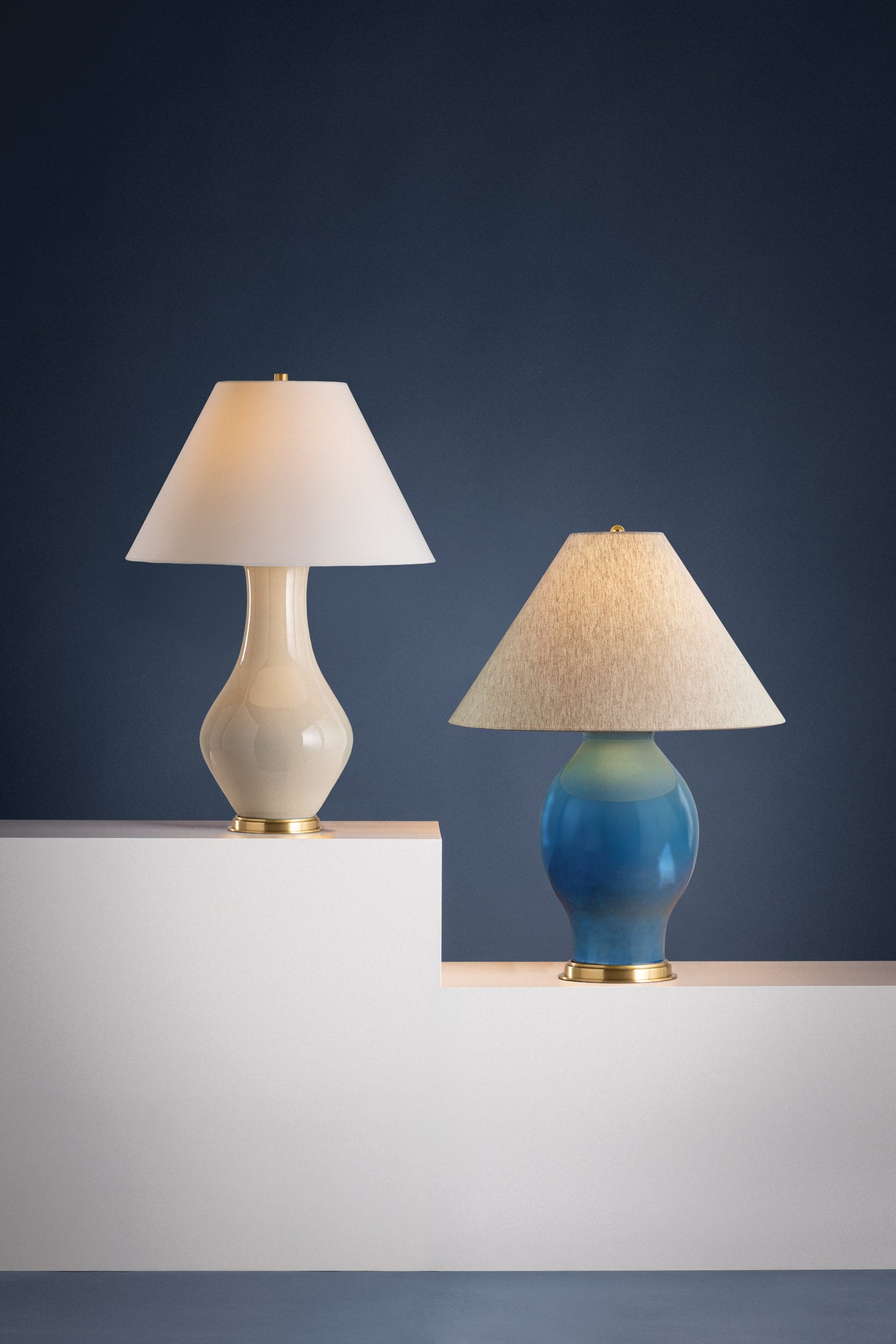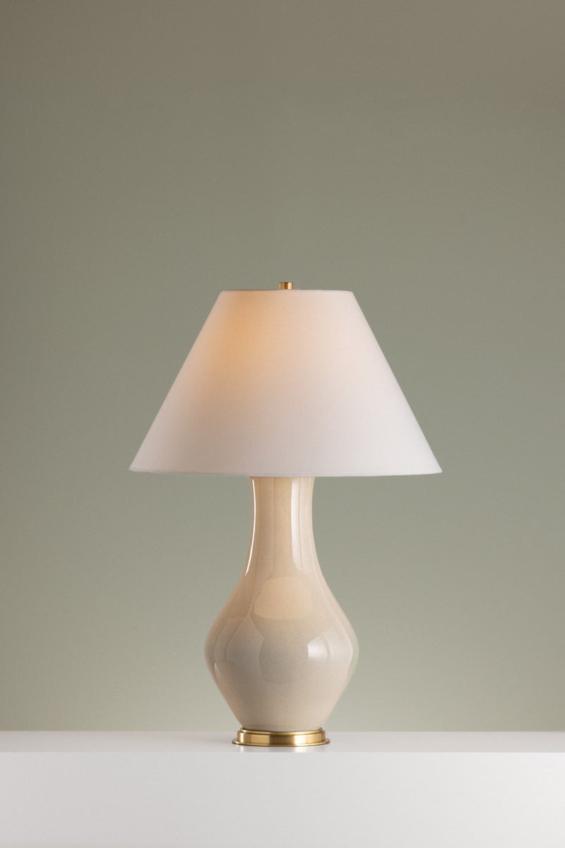 Artisanal and contemporary, Hanslope features a gracefully sculpted ceramic base paired with a crisp white linen shade. The unique form and proportions, coupled with the off-white French Muslin glaze give this lamp an earthy, organic feel. The glossy finish adds to the charm of this lovely everyday light fixture.