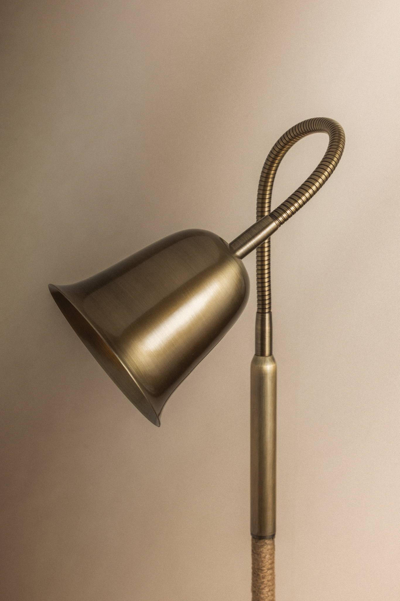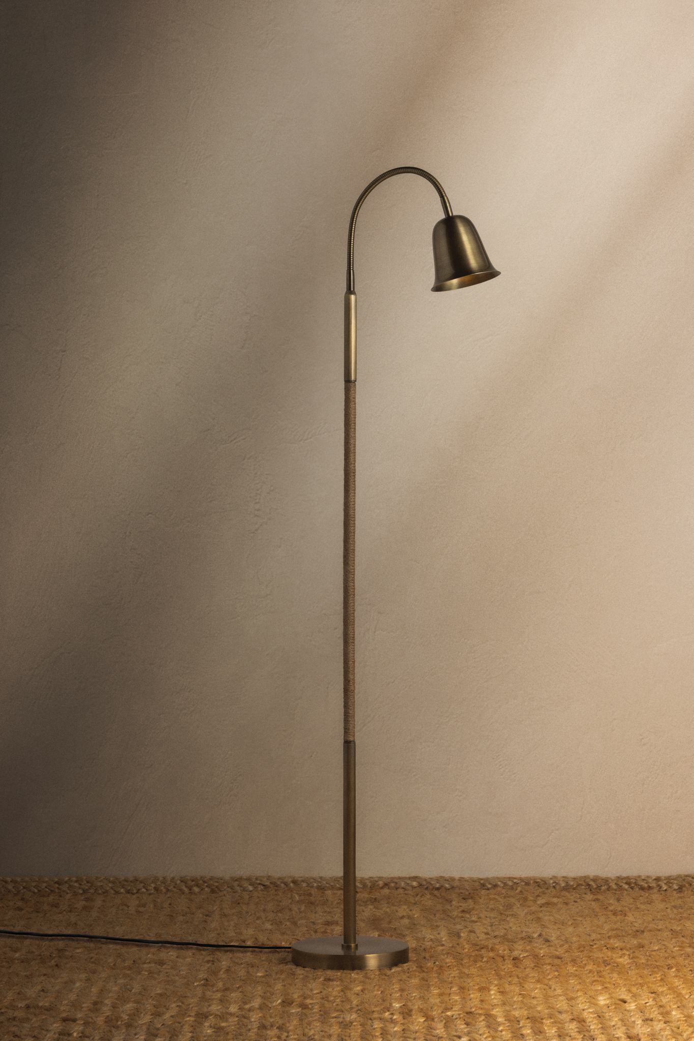 With playful proportions, a tactile material mix, Wharf balances functions and personality. The long, curving gooseneck is adjustable in any direction to create the perfect reading light, while the petite bell-shaped shade houses an MR16 bulb for precise illumination. Finished in Patina Brass, the metal base is partially wrapped in jute cord, adding texture and a subtle coastal nod.
