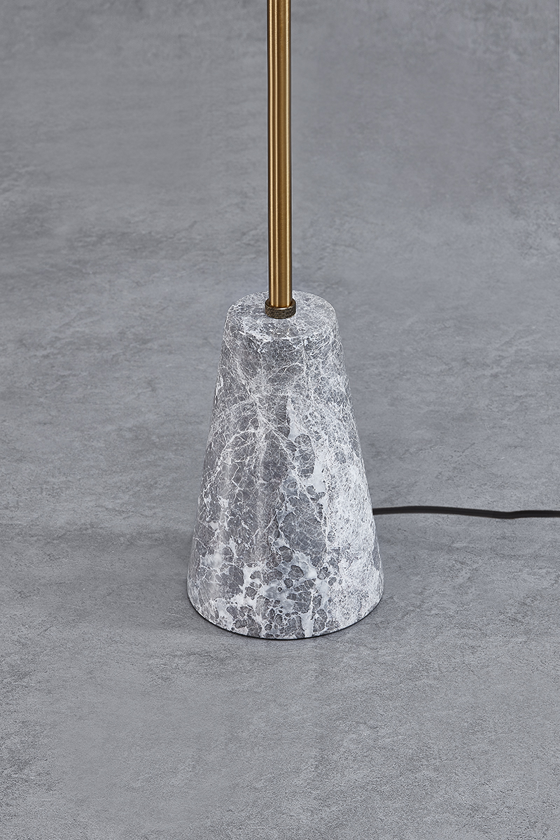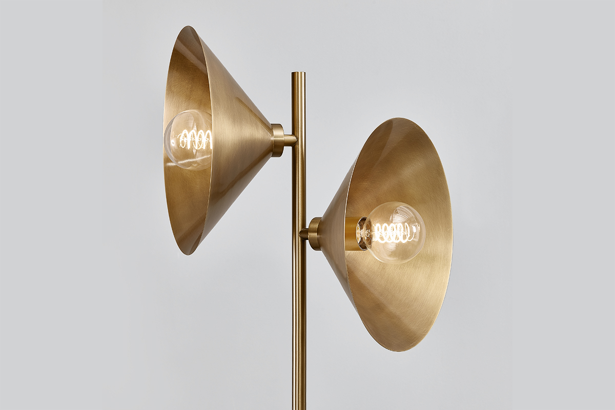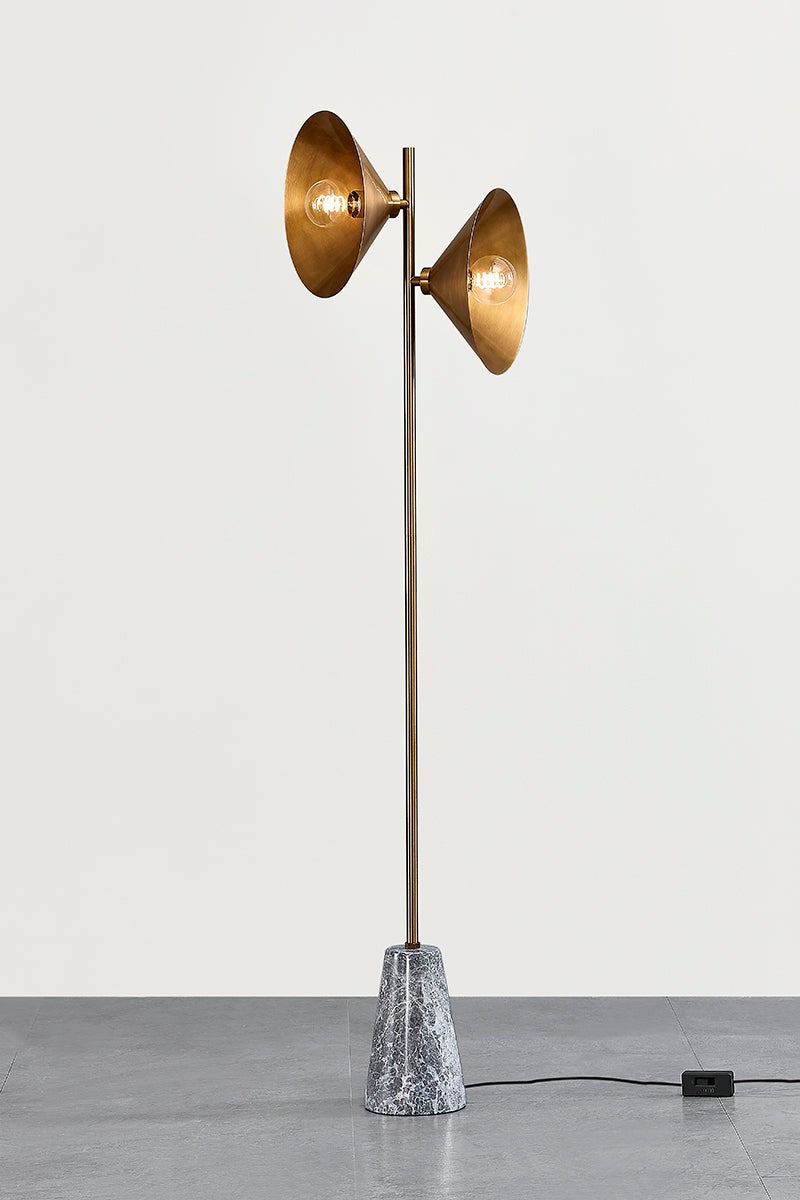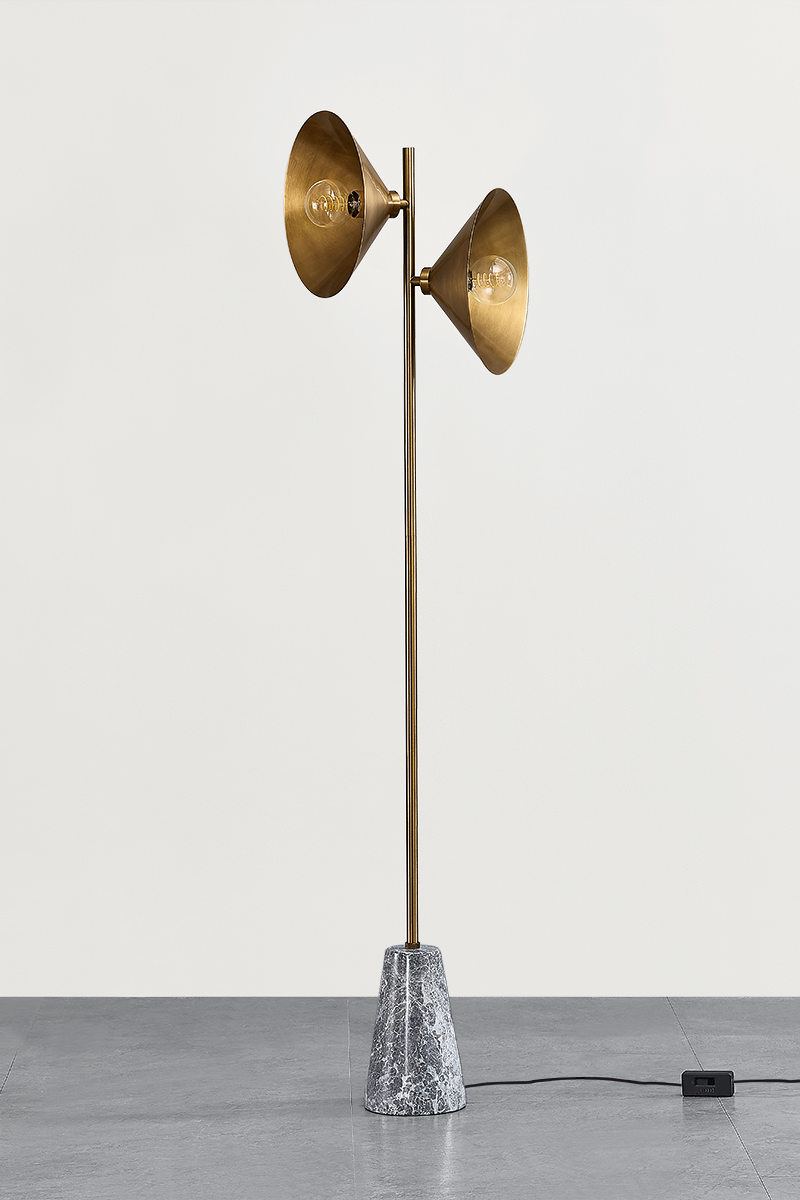 Bash draws inspiration from mid-century design and finished in warm Patina Brass. A Honed Grey Emperador Marble base adds a chic touch to the fixture. Wherever it is placed, Bash casts a wide spectrum of illumination, making an immediate impression.