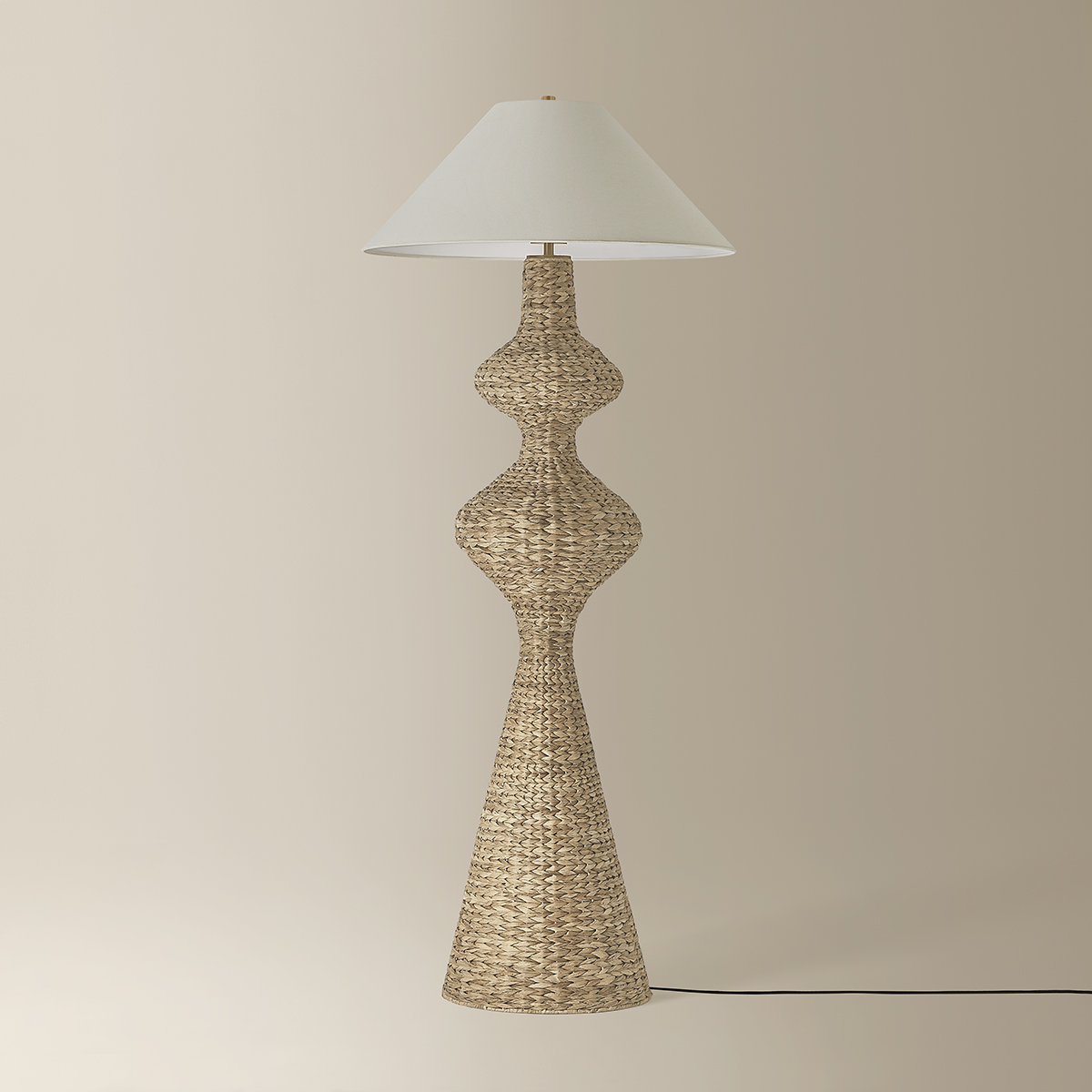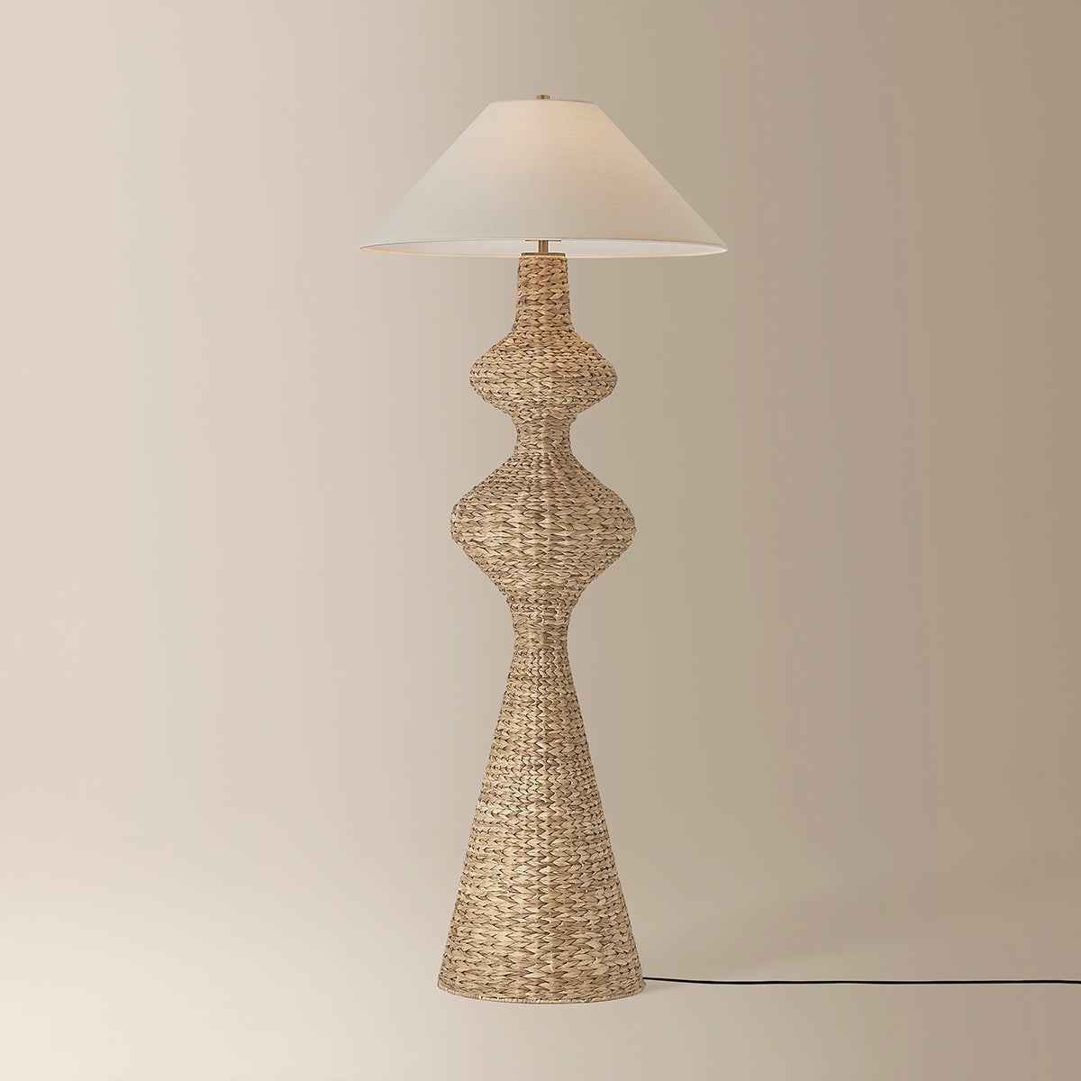 Equally bold as it is inviting, the Walter floor lamp pairs dimensional forms with organic textures. Woven entirely from water hyacinth, the elongated silhouette flows with rippling curves. A wide conical shade in soft off-white linen adds balance to the shape, while the Patina Brass fittings contribute to the earthy tonality of the lamp.