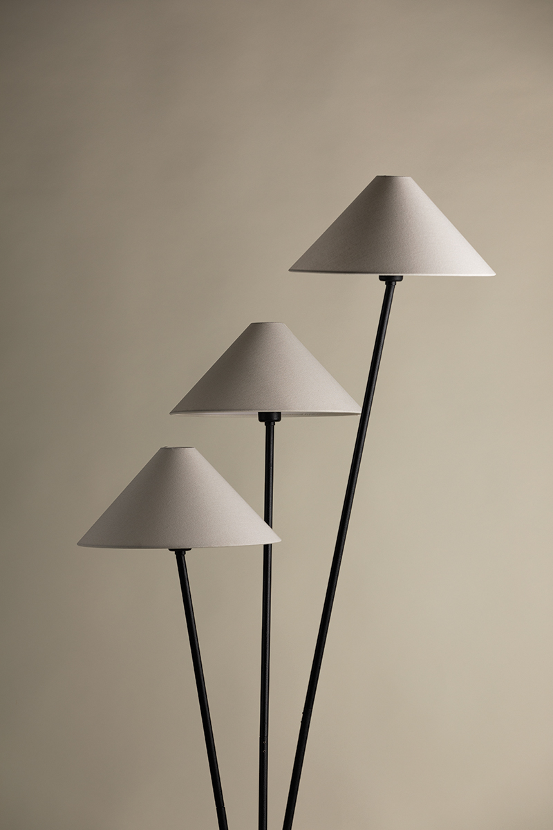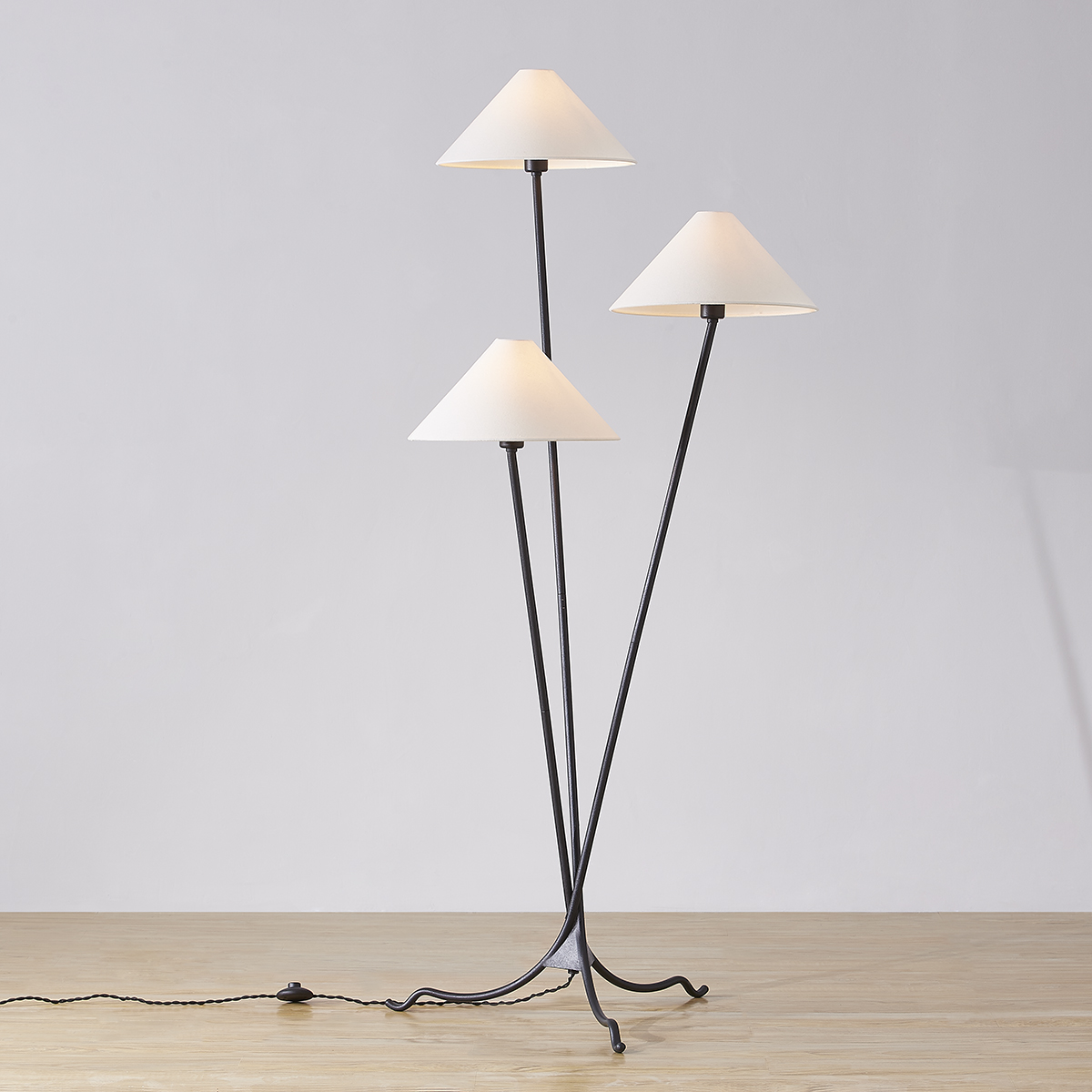 Sleek Forged Iron arms draw the eye to three tapered, off-white linen shades, creating a layered effect and giving Cedar its recognizable clean, modern silhouette. The floor lamp's unique tripod base and wavy feet add a touch of softness and unexpected whimsy.