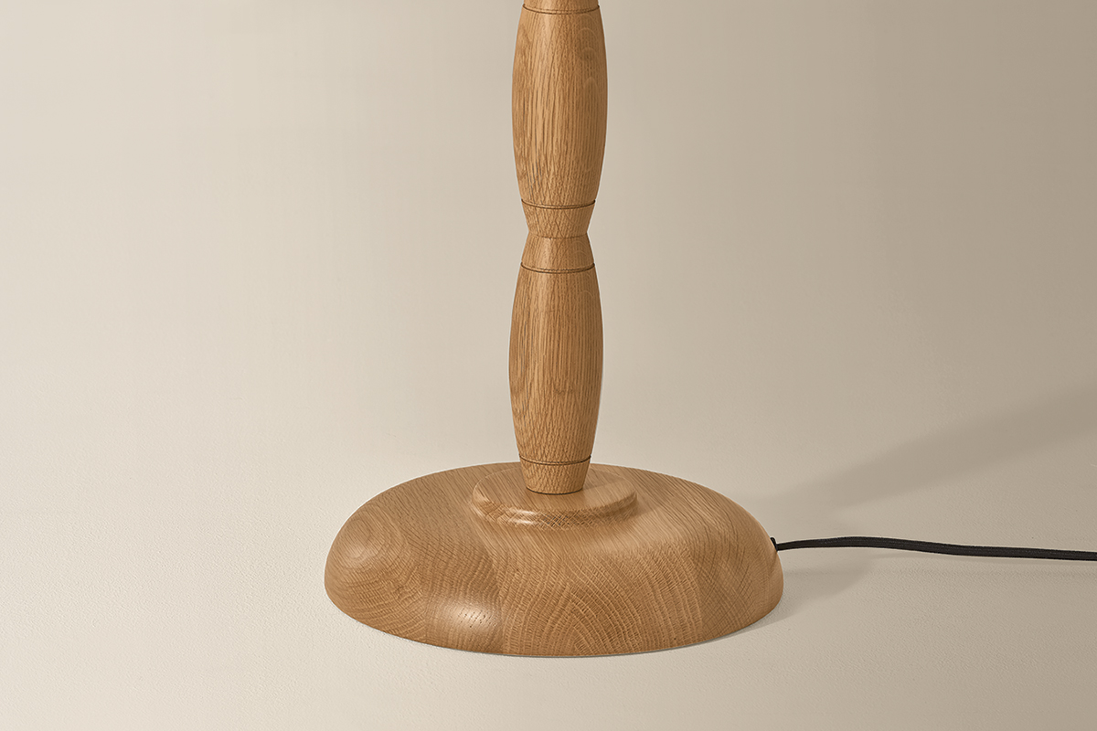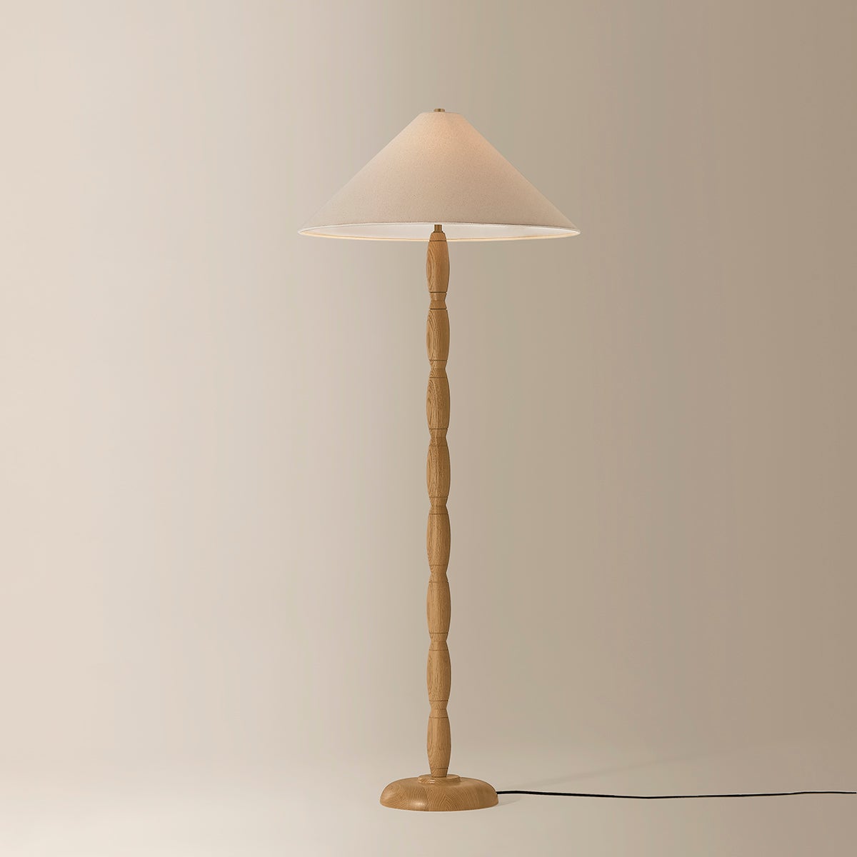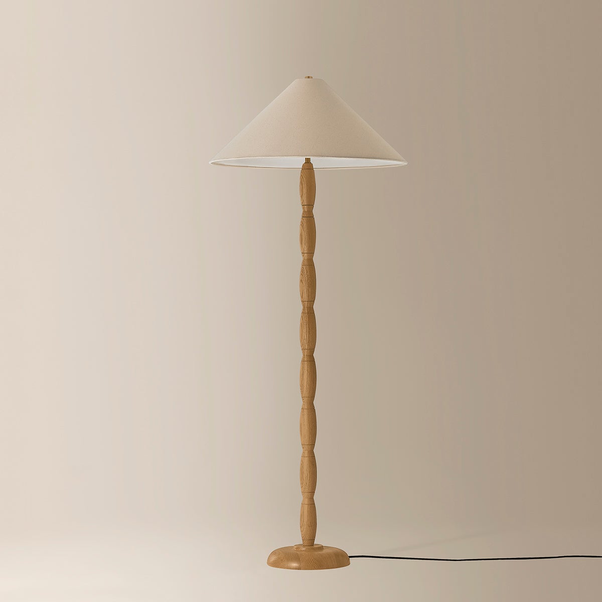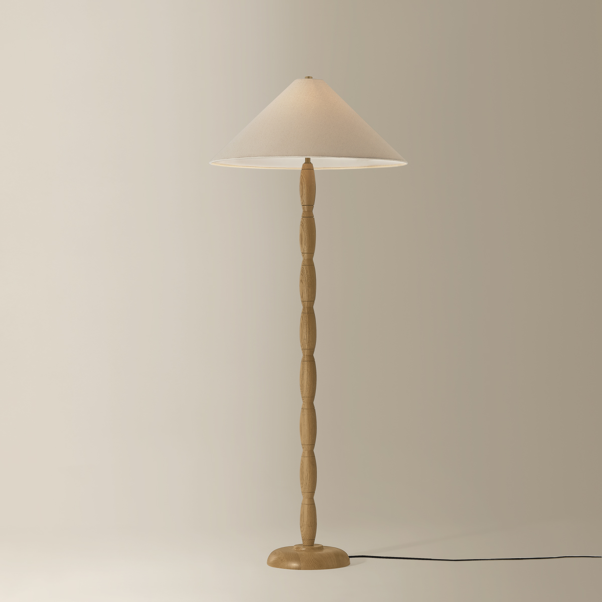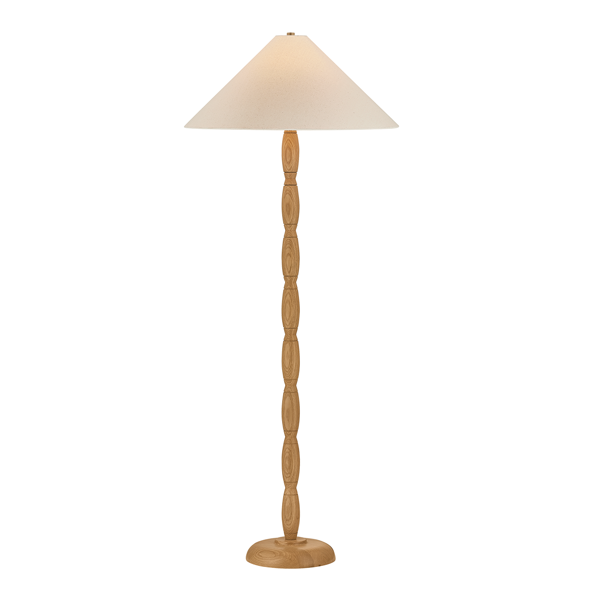 Celebrate the character and craftsmanship of vintage wood bobbin furniture with Parrish. The solid oak base of this floor lamp features a rhythmic series of soft curves that highlight the wood’s natural grain. A wheat linen shade gently diffuses the light, while Patina Brass accents add a contrasting element. Whether in use or not, this characterful lamp is a stylish accent in living, reading, and bedroom spaces.