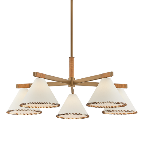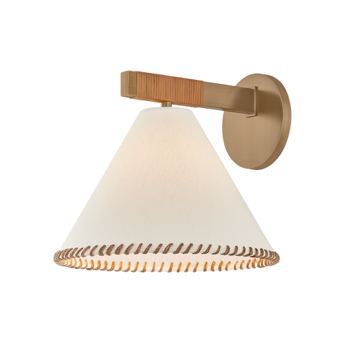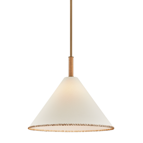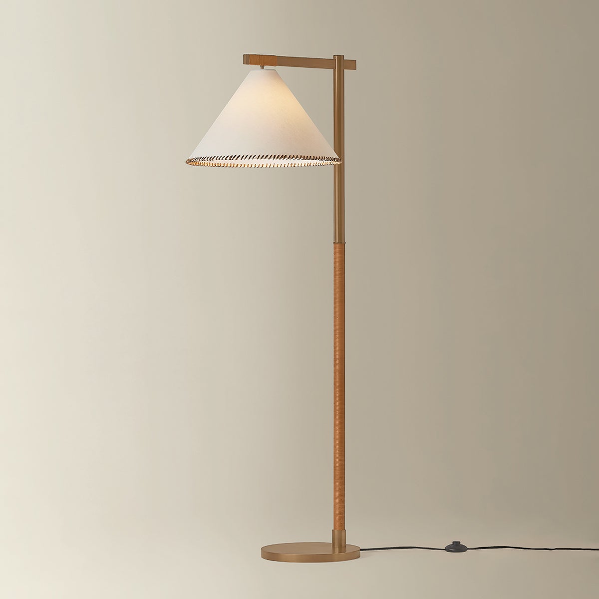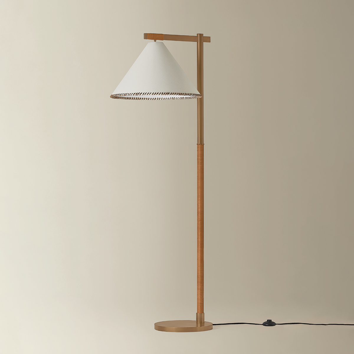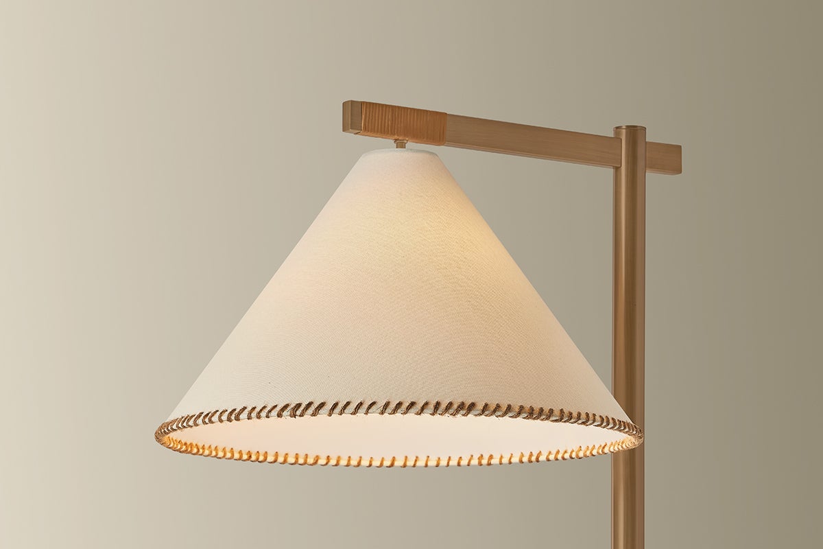The architectural design language of the Stoney family is softened by its unique material qualities. Large conical white linen shades are edged with contrasting whip-stitching, echoing the natural jute wrap details along the Patina Brass frames. Available as a 1-light sconce, 1-light pendant, 5-light chandelier, and 1-light floor lamp, Stoney is an ode to craftsmanship.