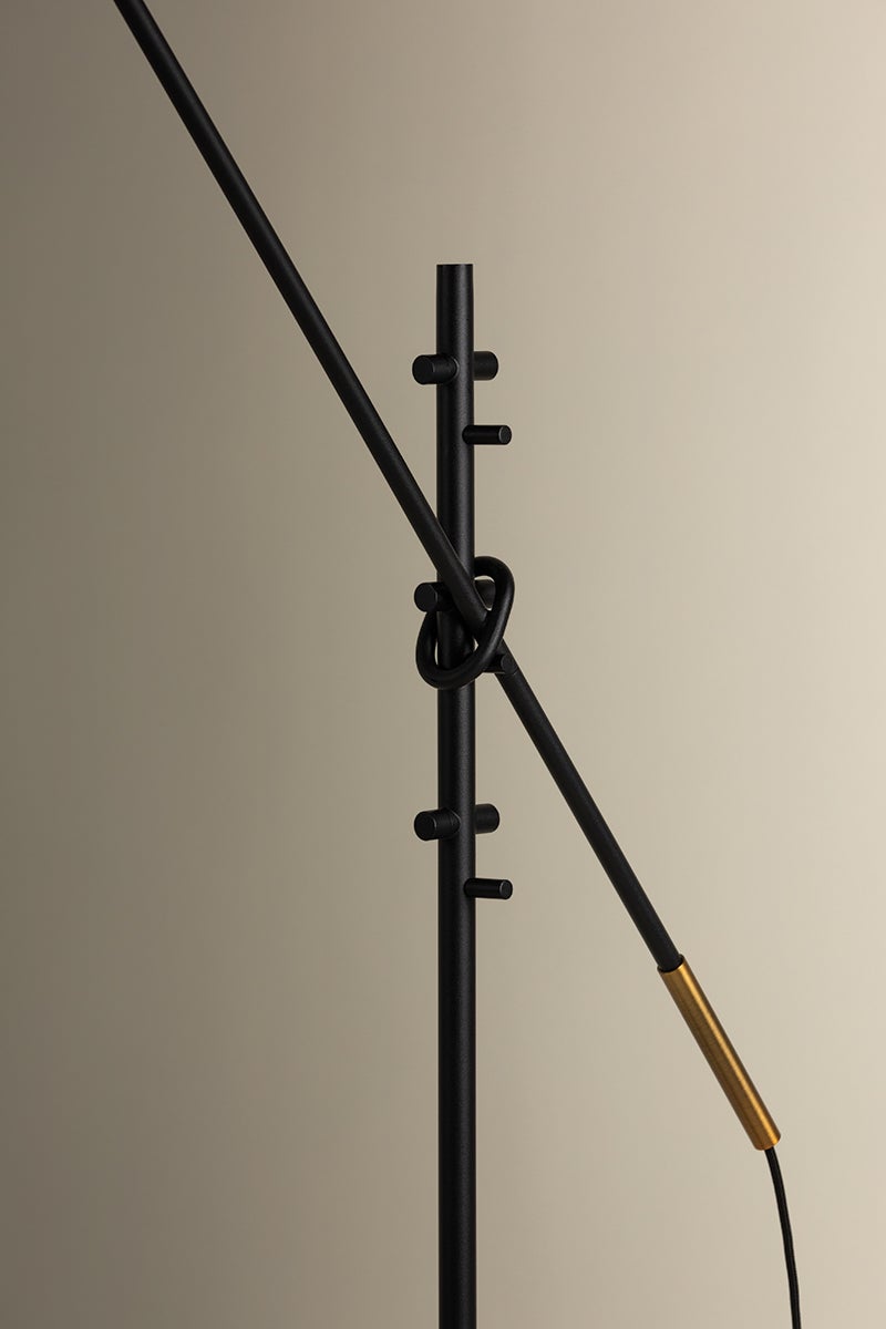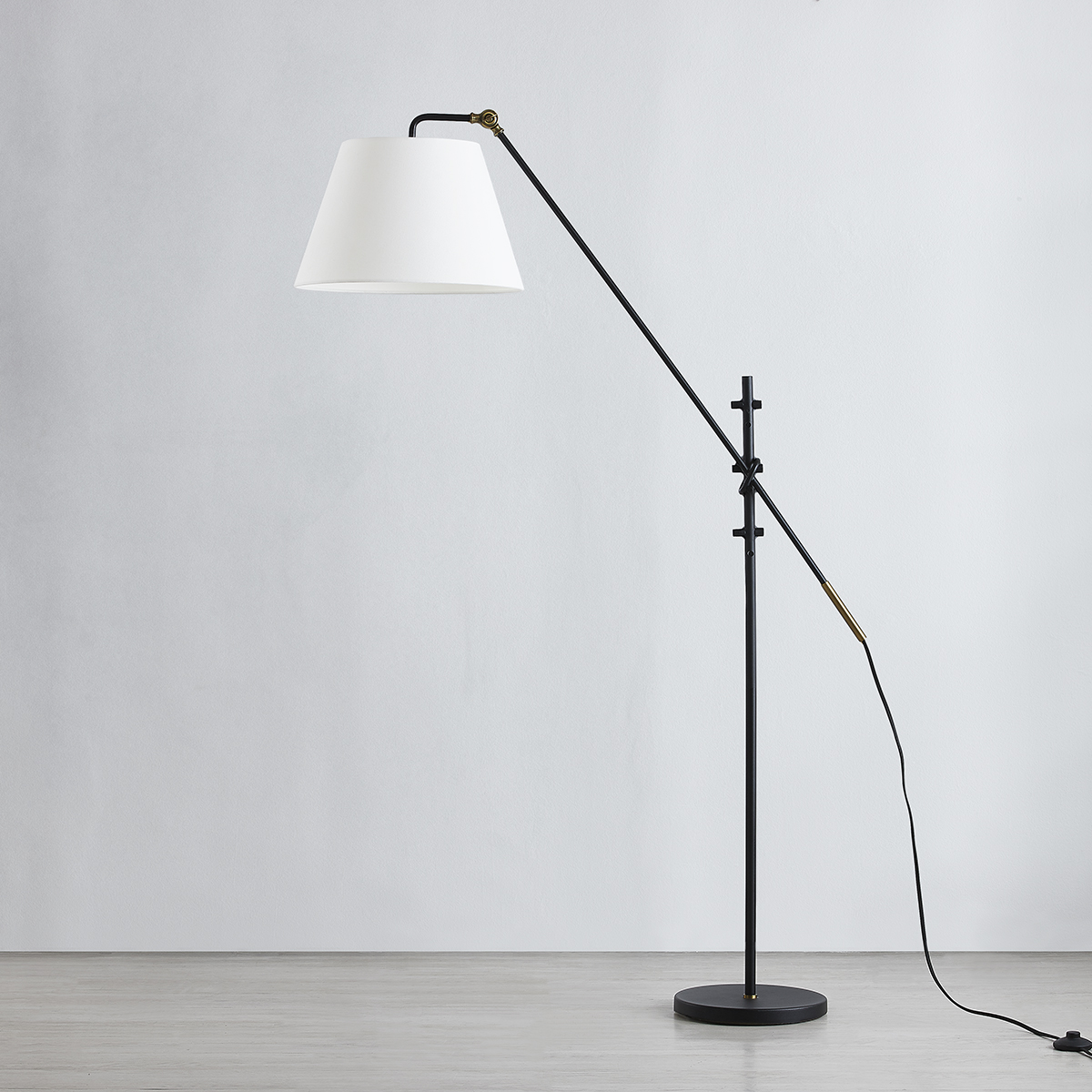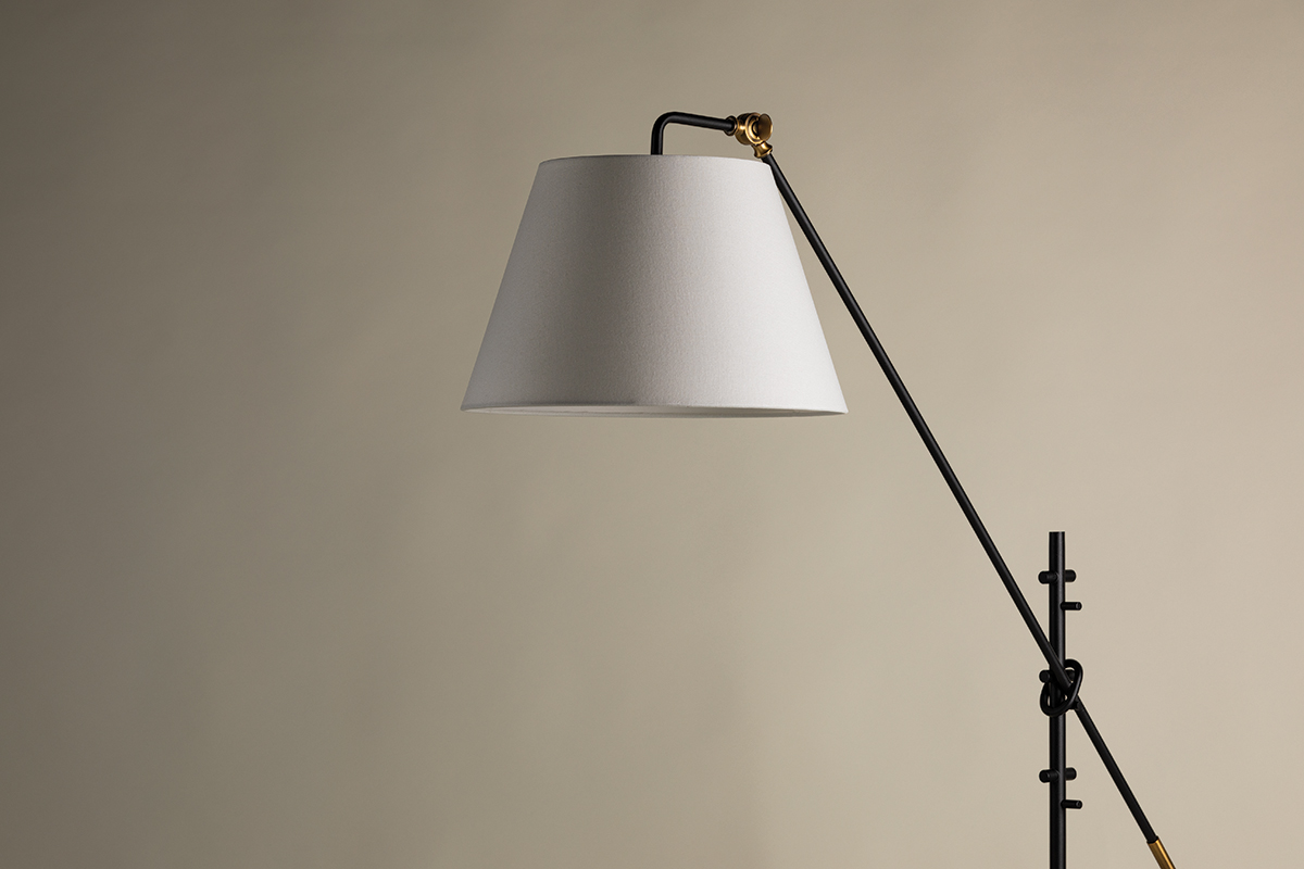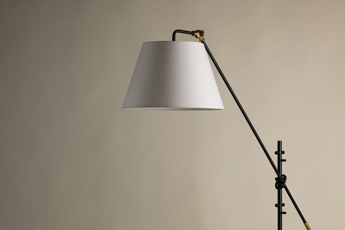 Navin's slender Textured Black arms and tapered white-linen drum shades get an industrial-inspired upgrade with mechanical parts in Patina Brass. Both the arm and shade angles of the floor lamp, chandelier, and sconce are fully adjustable to provide customized lighting for any space.