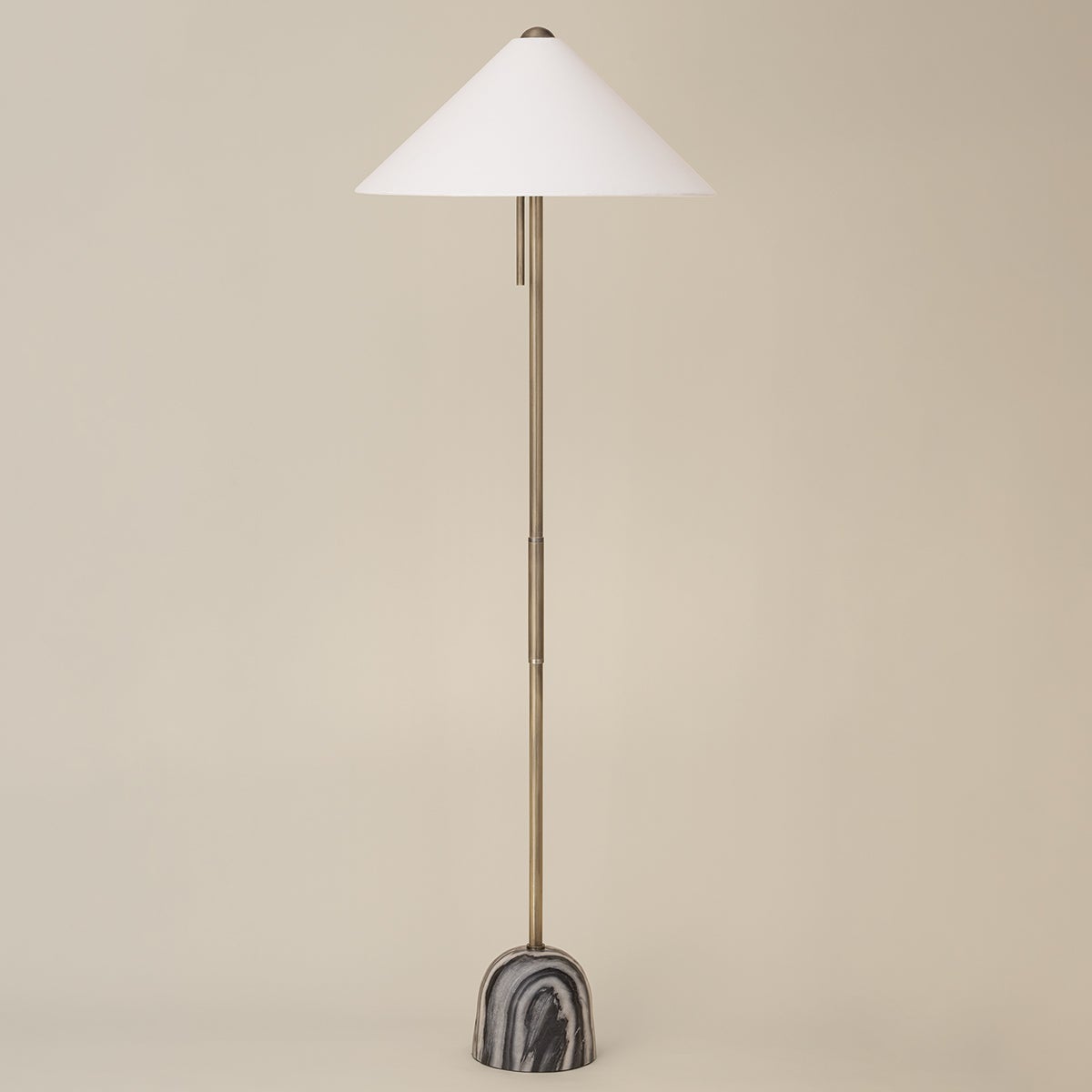 The Millbrae family merges neoclassicism with contemporary softness. Each table and floor lamp rests on a honed black Indian marble base with natural veining, lending individuality to every piece. A Patina Brass stem supports the conical off-white linen shade, finished with a sculptural finial. Highly versatile, Millbrae brings an air of luxury to living spaces, bedrooms, and reading nooks.
