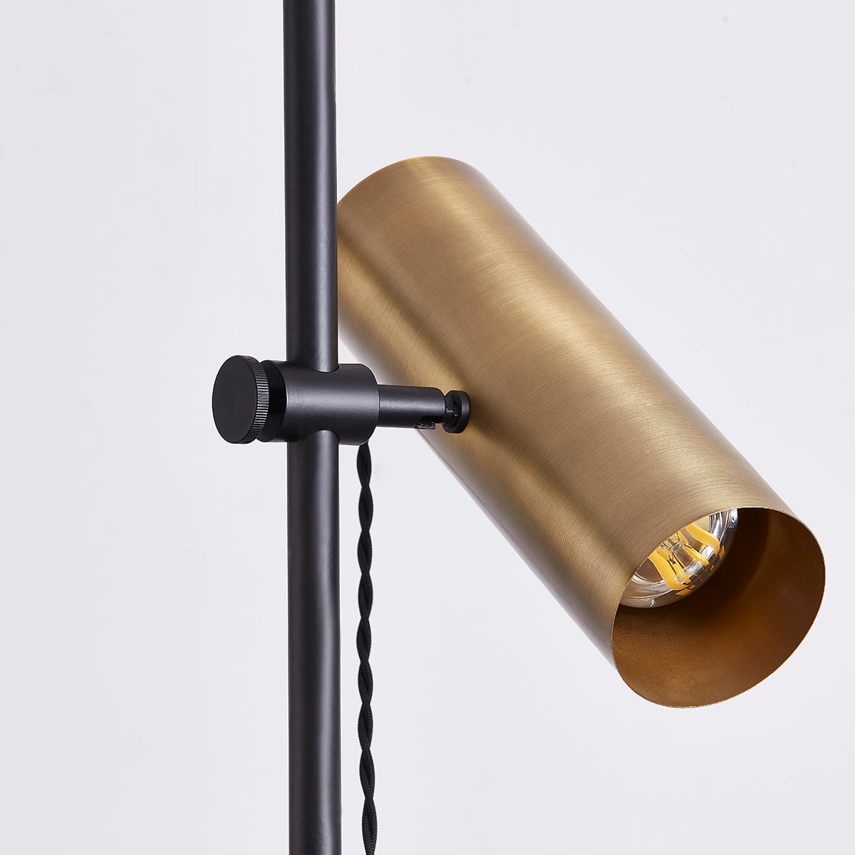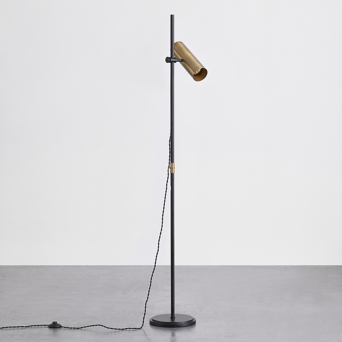 Quinn brings a chic industrial vibe to mid-century modern design. A cylindrical metal shade on a slim Soft Black pole pairs with functional details like a braided cord looped through the Patina Brass accent. Both the lamp angle and its height on the pole are fully adjustable to add the perfect task lighting to any space.