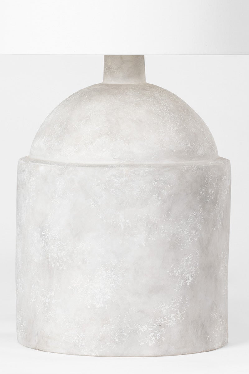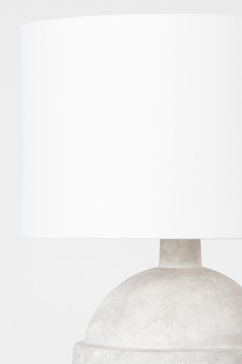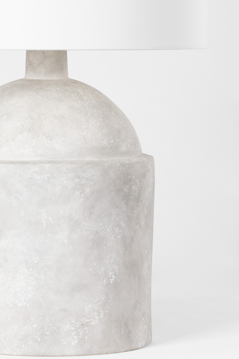A smooth jug-shaped base in Ceramic Weathered Grey is topped by an off-white linen drum shade. The weathered finish adds texture and a vintage vibe. With its neutral tones and natural shape and finish, this table lamp is the perfect way to bring a clean, organic style to a space.