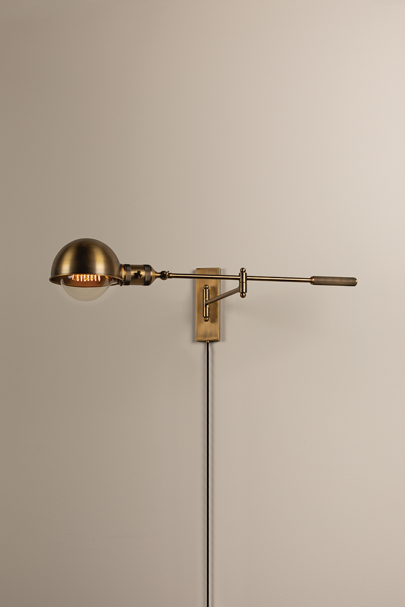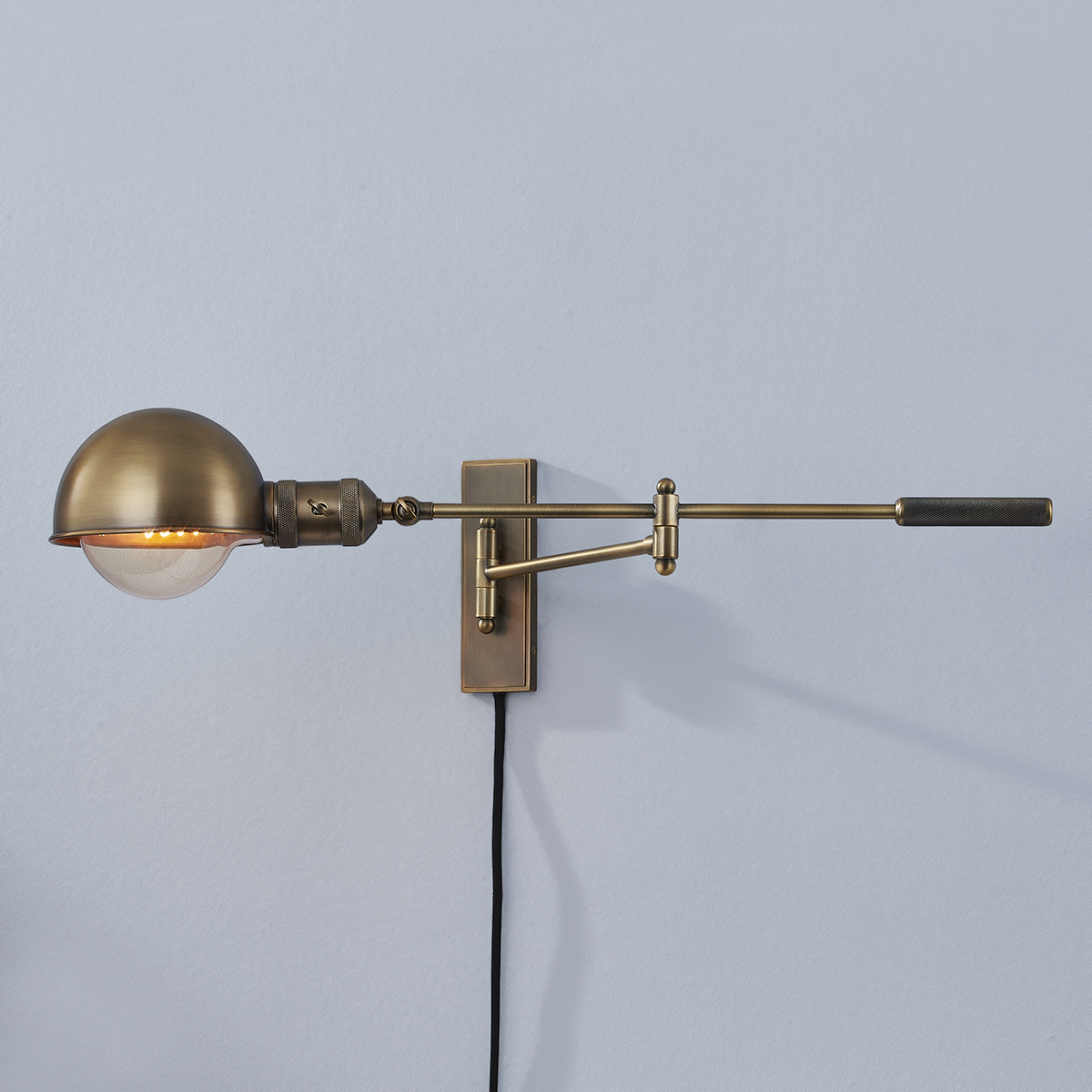 A dome-shaped Patina Brass shade at the end of a long, slender arm with exposed hardware give Cannon its retro industrial vibe. High-end details like the intricate knurling on the handle and socket add an air of sophistication. Both the arm and lamp angles are fully adjustable, making this slim-profile, plug-in sconce perfect for spaces that could benefit from customized lighting.