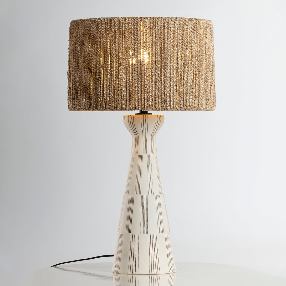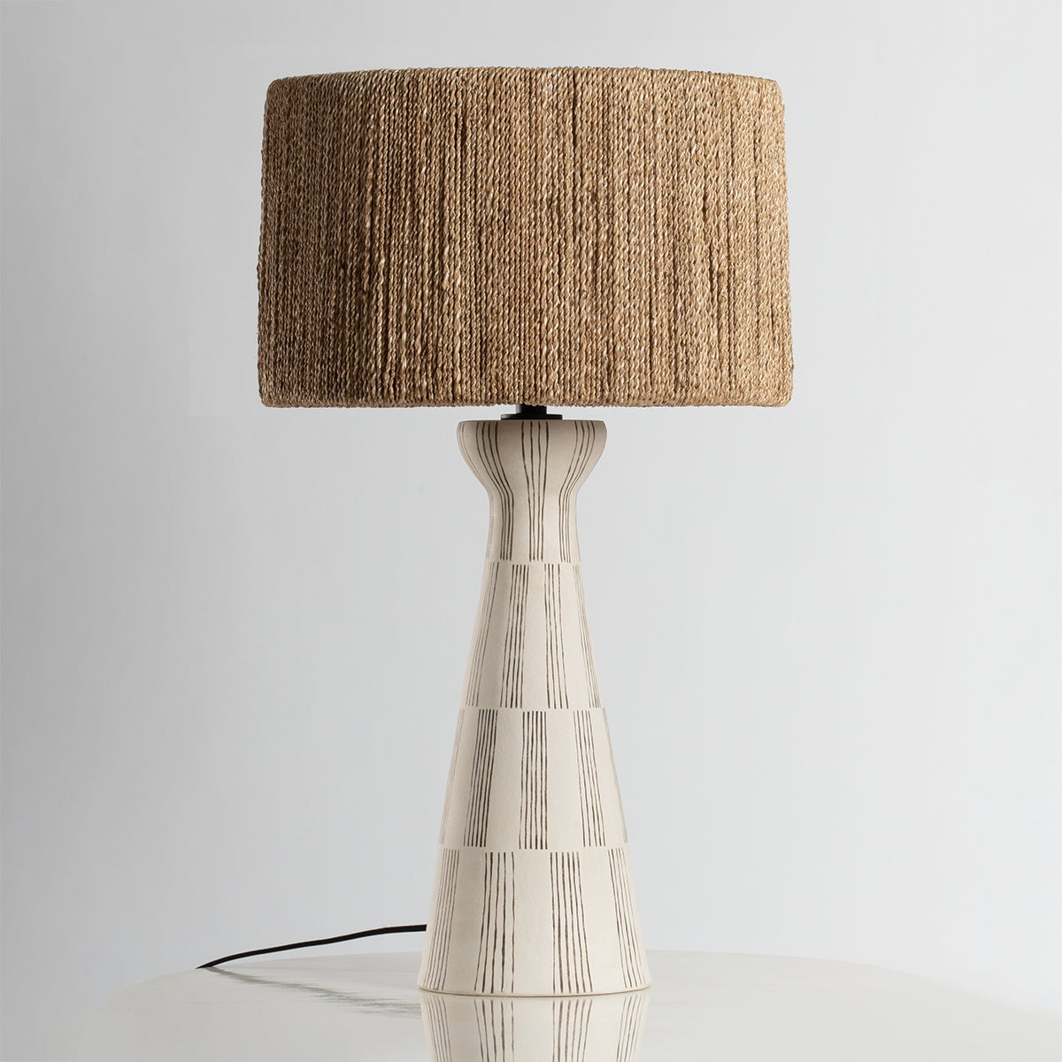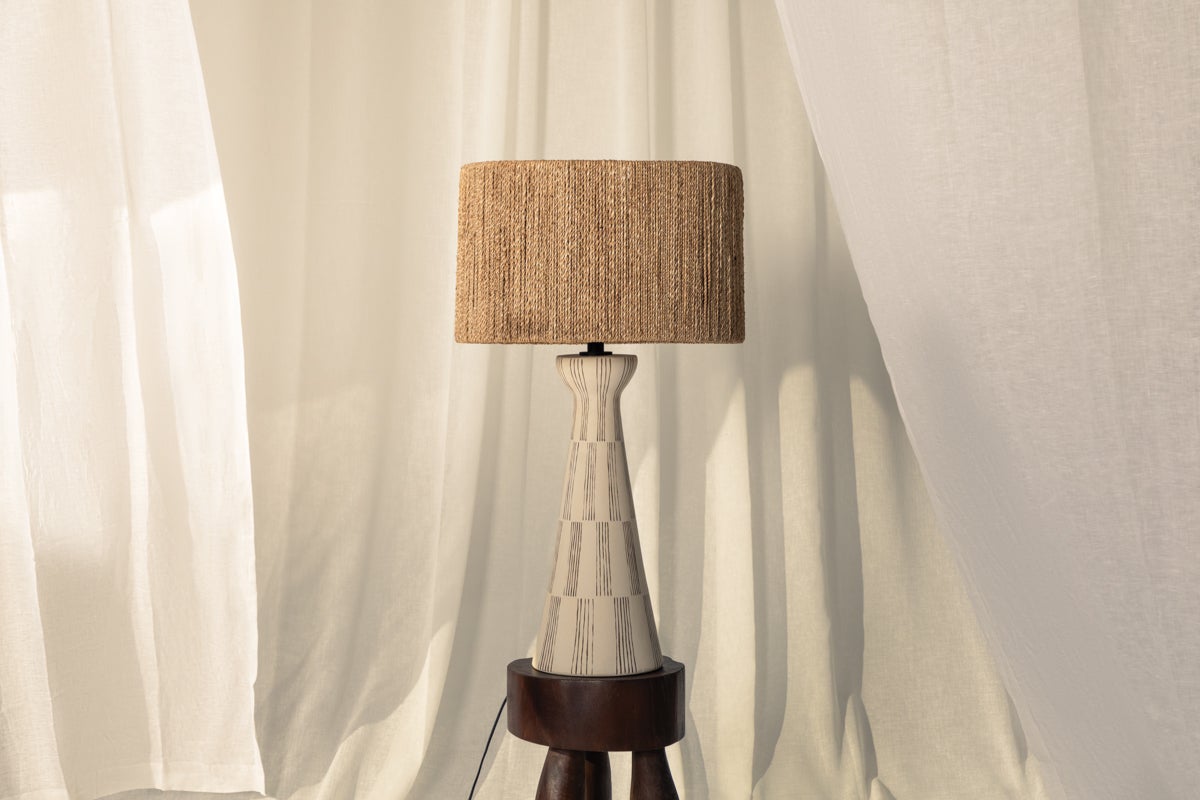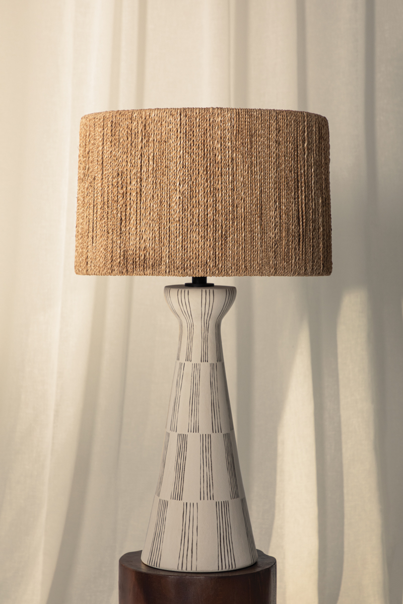 Named nostalgically for Nash’s native home in Florida, Palma is designed with a silhouette and textured sides that take cues from the palm tree. The detailed linework on the white ceramic body mirrors the weave on the natural string shade, creating a unified appearance. An exploration of verticality, while honoring its statement-making details. Part of our Loft and Thought collection.
