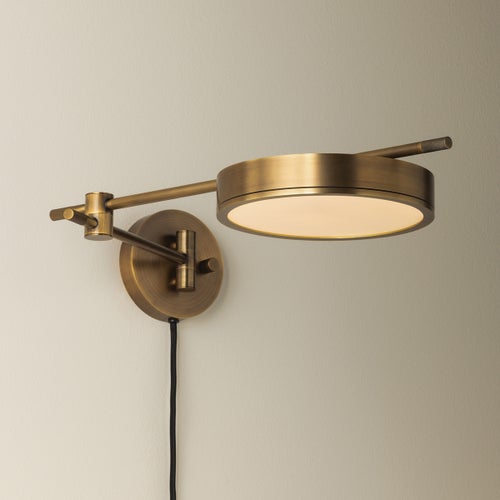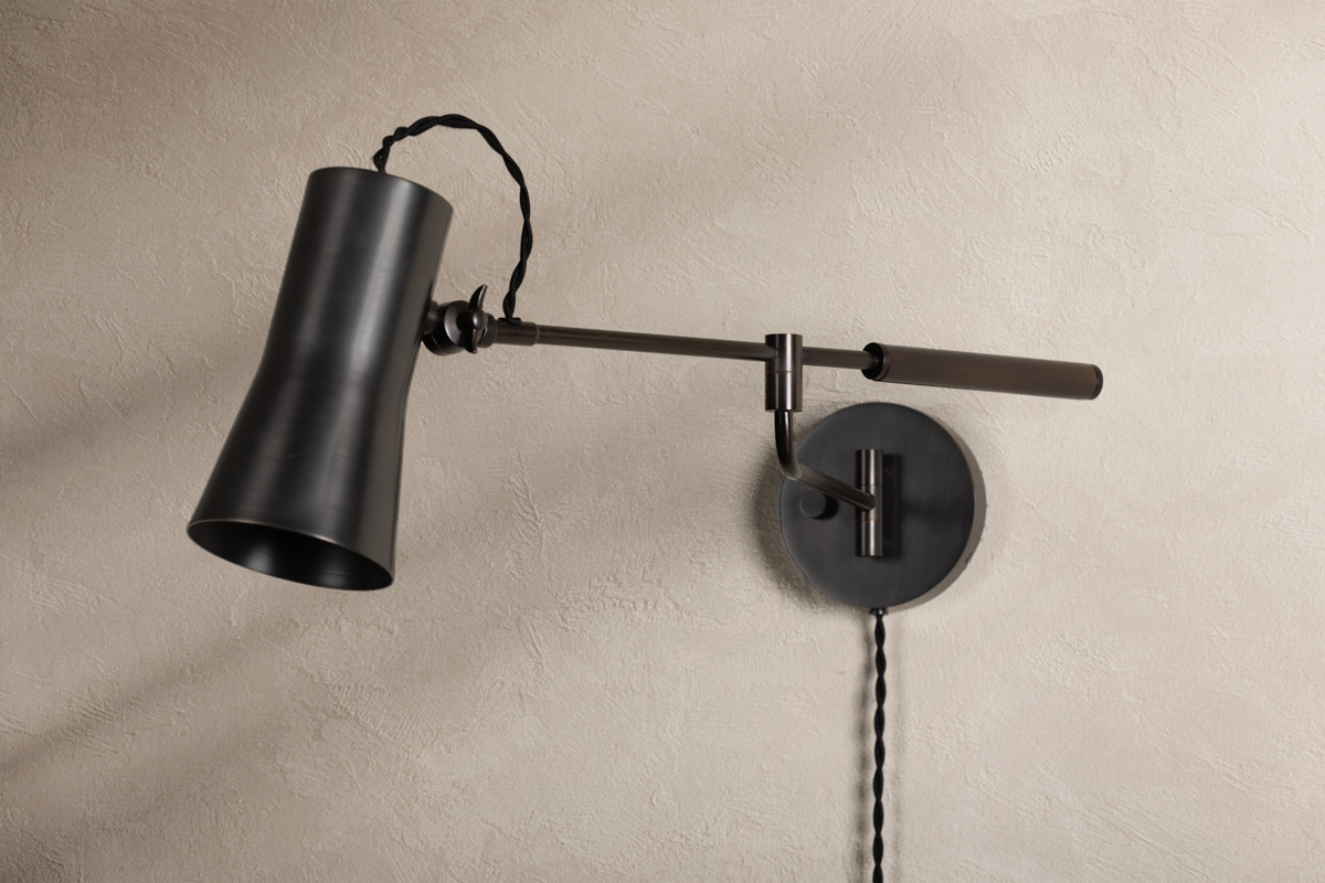 Tailored task lighting, this portable, functional swing arm sconce is also thoughtfully designed and beautiful. The sleek arm features a wooden handle on one end and an adjustable metal shade in Patina Brass or Bronze on the other. The twisted black cord detailing at the shade and backplate give Novel a nostalgic feel. Part of our Lauren Liess collection.