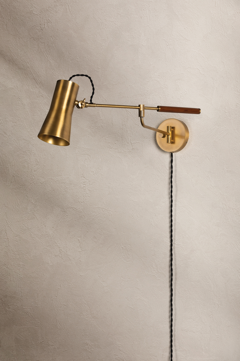 Tailored task lighting, this portable, functional swing arm sconce is also thoughtfully designed and beautiful. The sleek arm features a wooden handle on one end and an adjustable metal shade in Patina Brass or Bronze on the other. The twisted black cord detailing at the shade and backplate give Novel a nostalgic feel. Part of our Lauren Liess collection.
