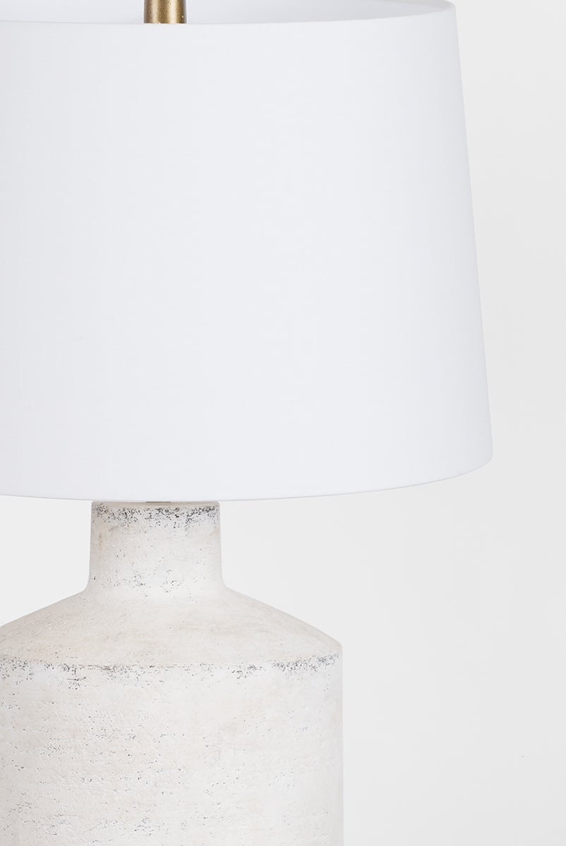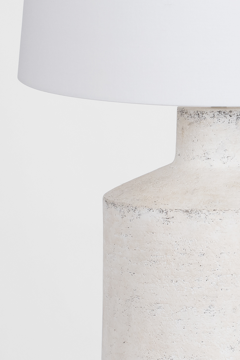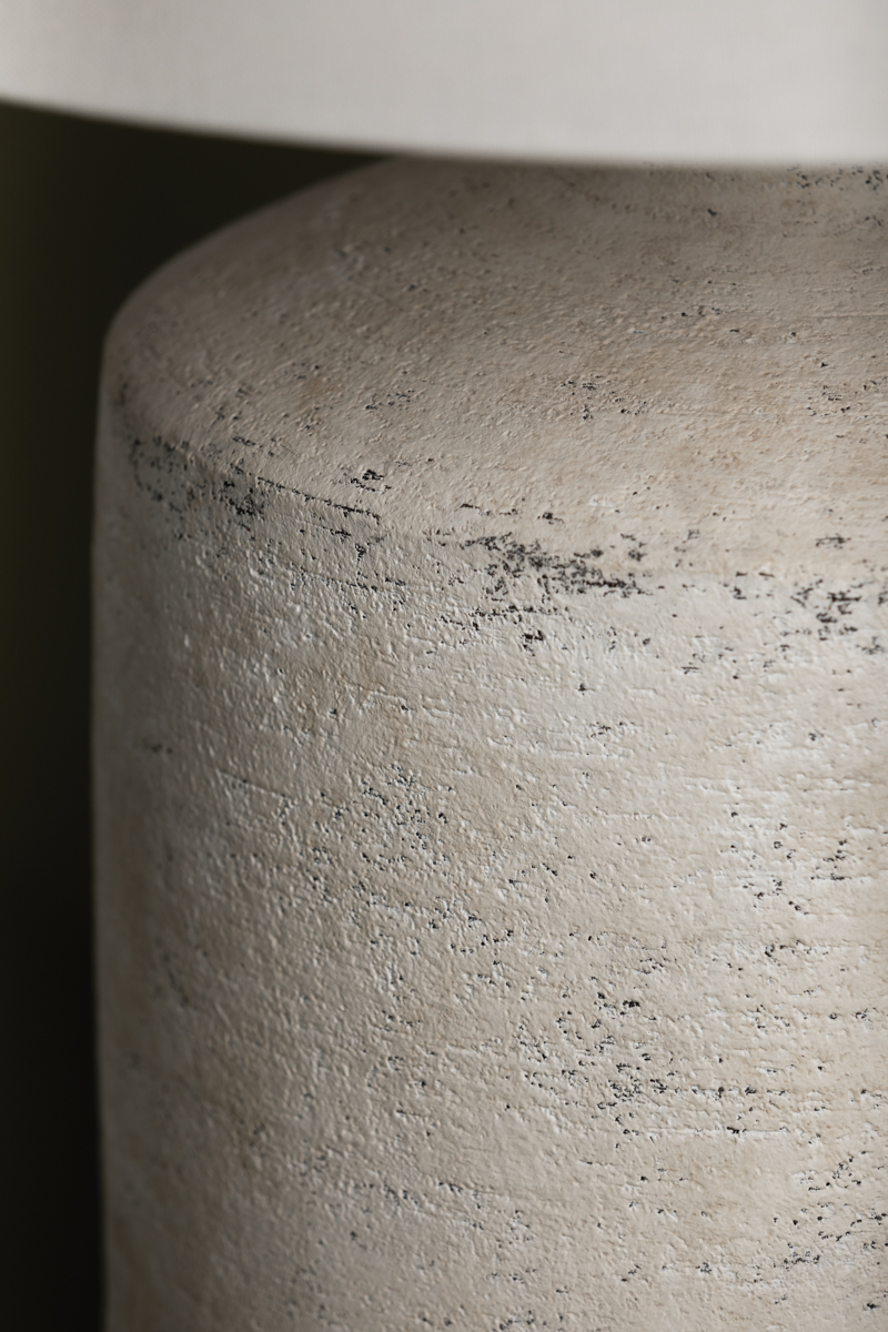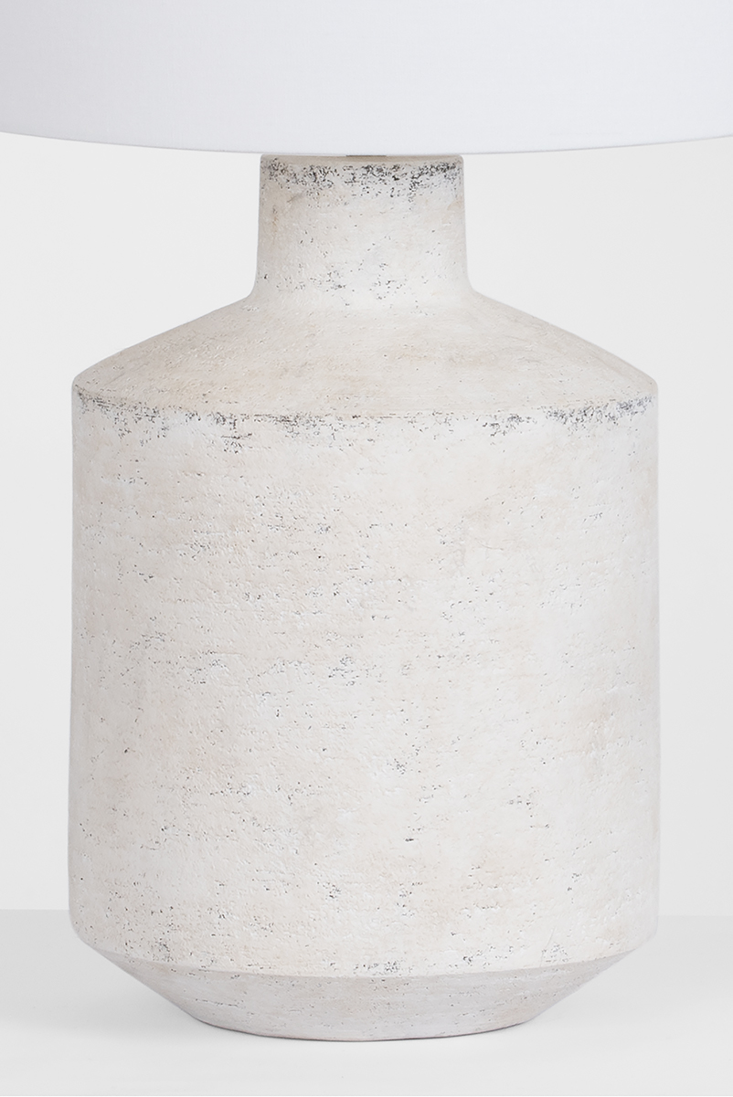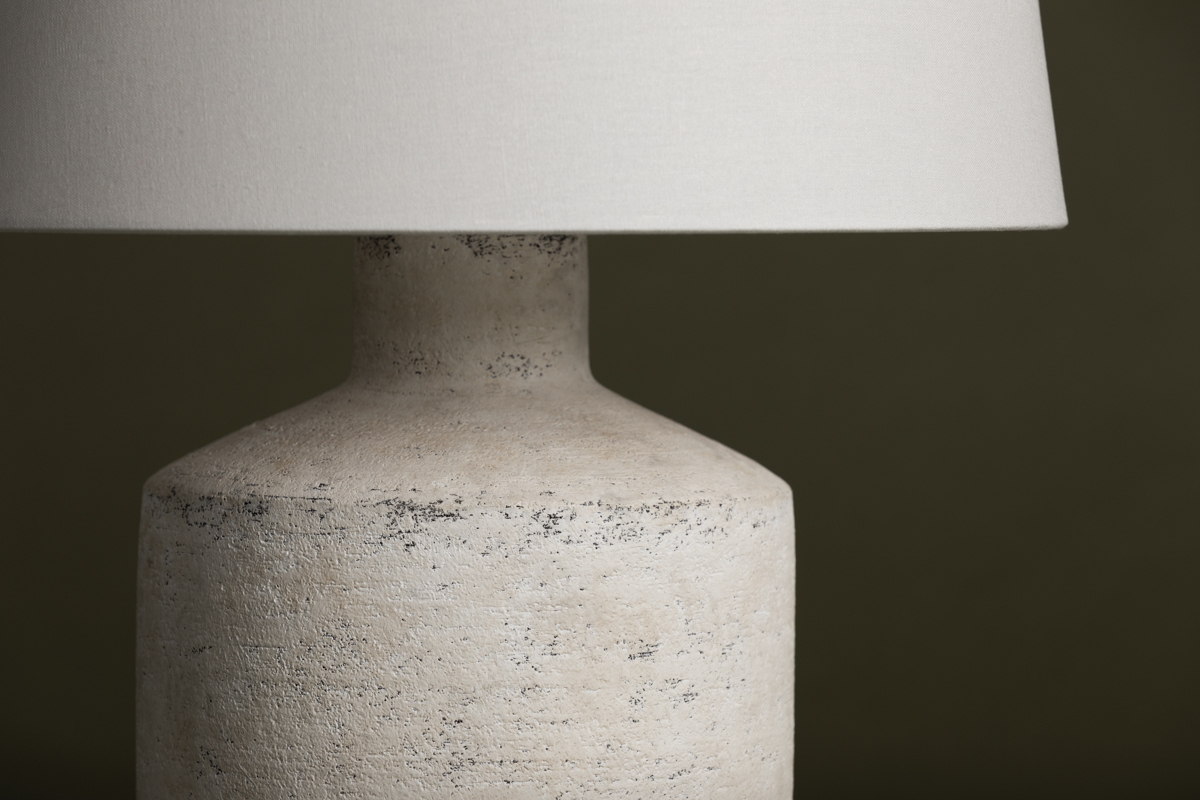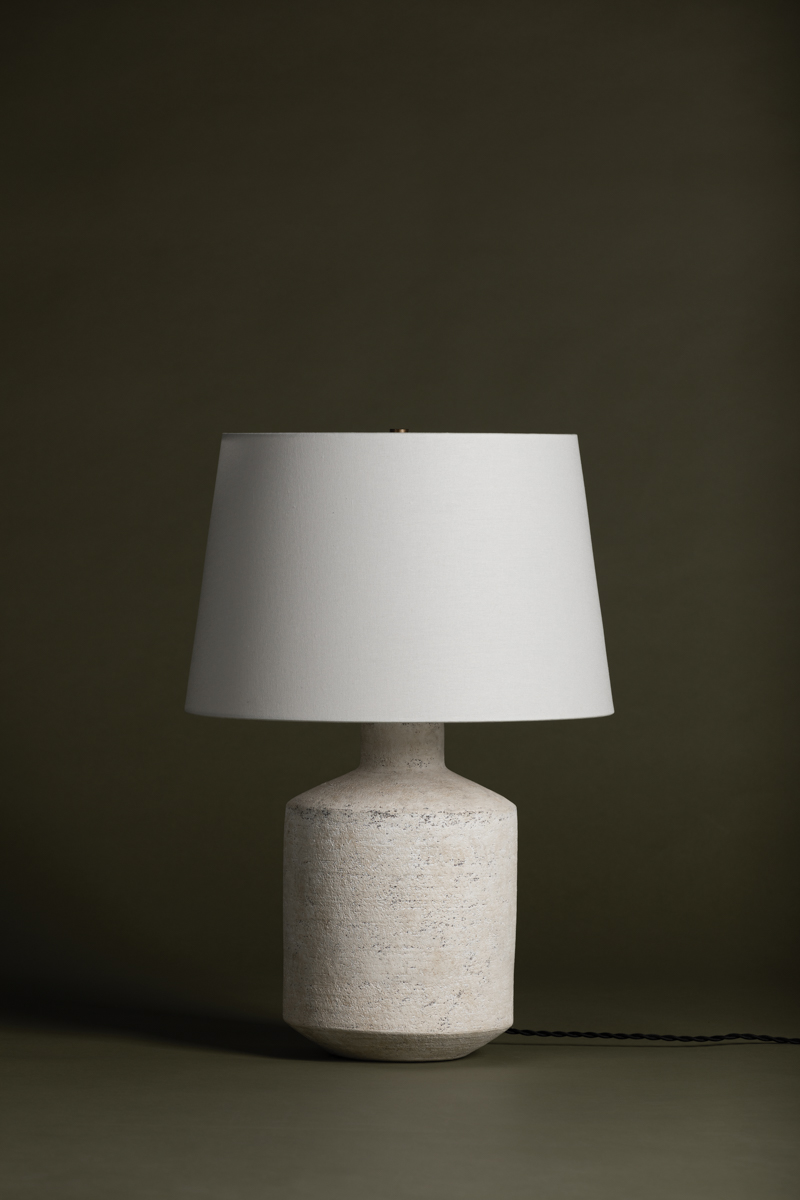This sleek, subtle lamp is a natural, neutral way to add an organic modern style to any tabletop. Light shines down from the white linen drum shade highlighting the texture and natural color variations in the weathered finish of the artifact white ceramic base.