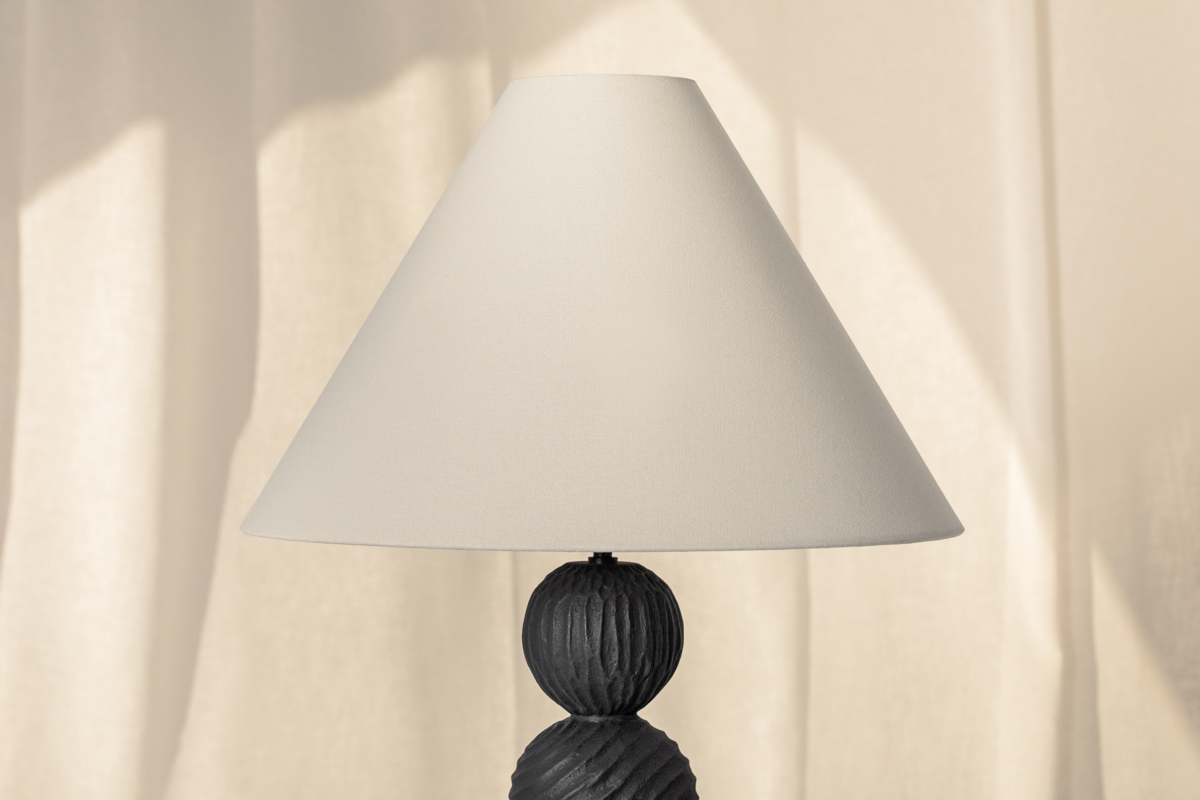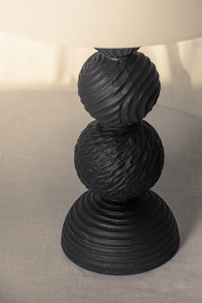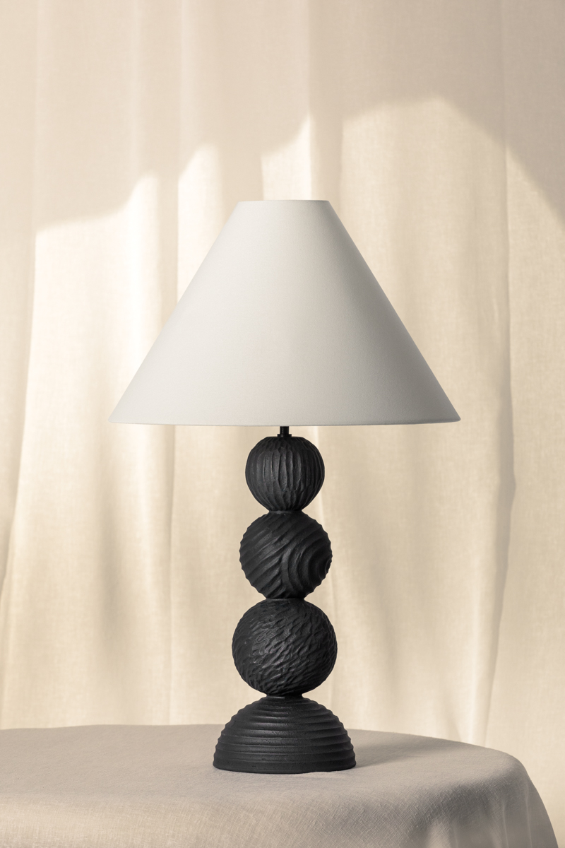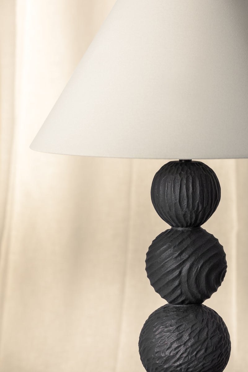 A totem-style design with rhythmic energy, Miela conceptually aligns with folk art aesthetics. Incised spheres reminiscent of carved wood are modeled from Black Motif Ceramic, resulting in a striking, polished appearance. Miela is further enhanced by an oversized pull chain and frame finished in Forged Iron. The off-white linen shade introduces a clean point of contrast. Part of our Loft and Thought collection.