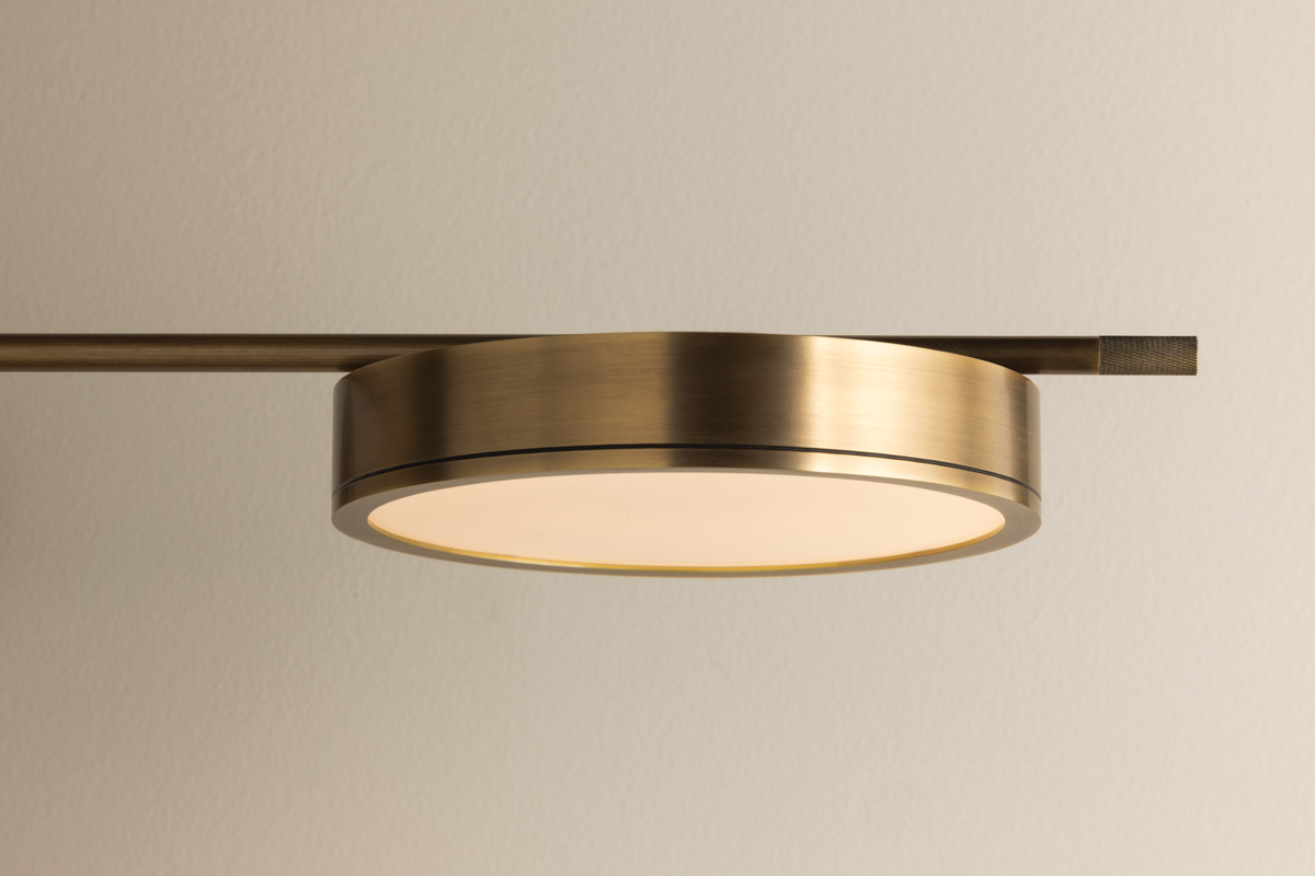 Upscale, yet highly usable, the Thatcher sconce features a striking interplay of graphic shapes. Connected by a slender arm with articulating joints, the puck-like shade mirrors the circular backplate. Finished in Patina Brass, Thatcher is perfect at a bedside or in a living room above a side table.