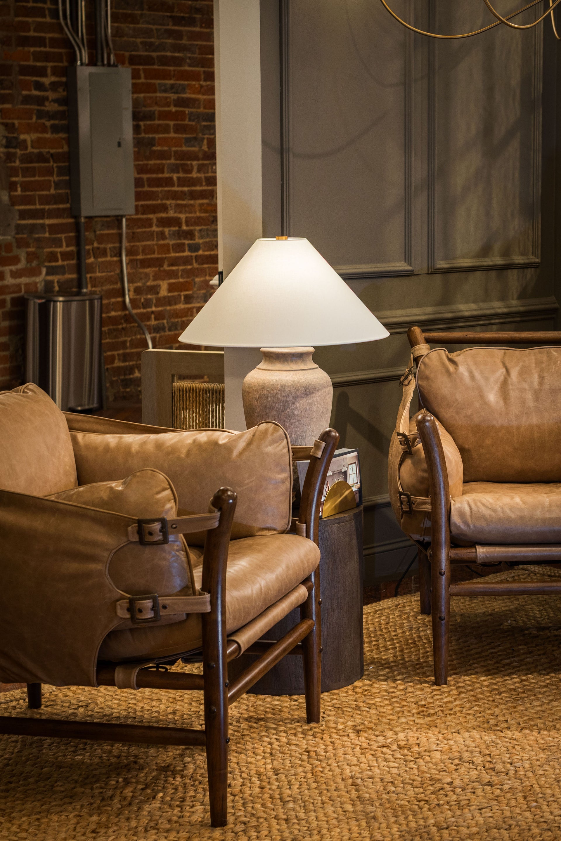 Inspired by Ancient Roman pottery, Vessel features a statuesque, elongated base with a richly textured finish that evokes clay layered by hand. A sharply tapered white linen shade balances the earthy hues with a note of freshness while Patina Brass hardware adds a subtle glint at the neck. Earthy yet refined, Vessel pairs beautifully with Unearthed for a collected, sculptural feel.