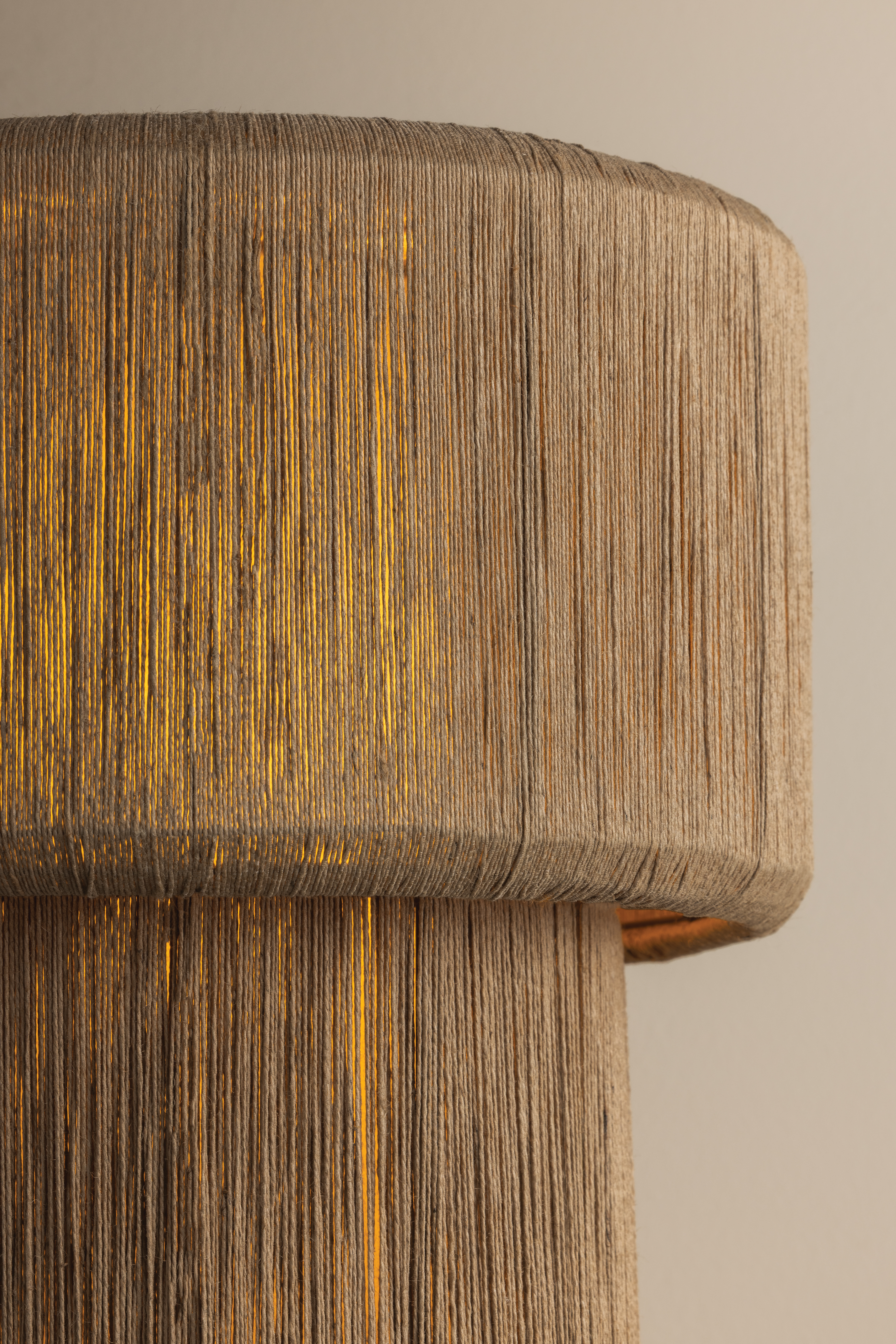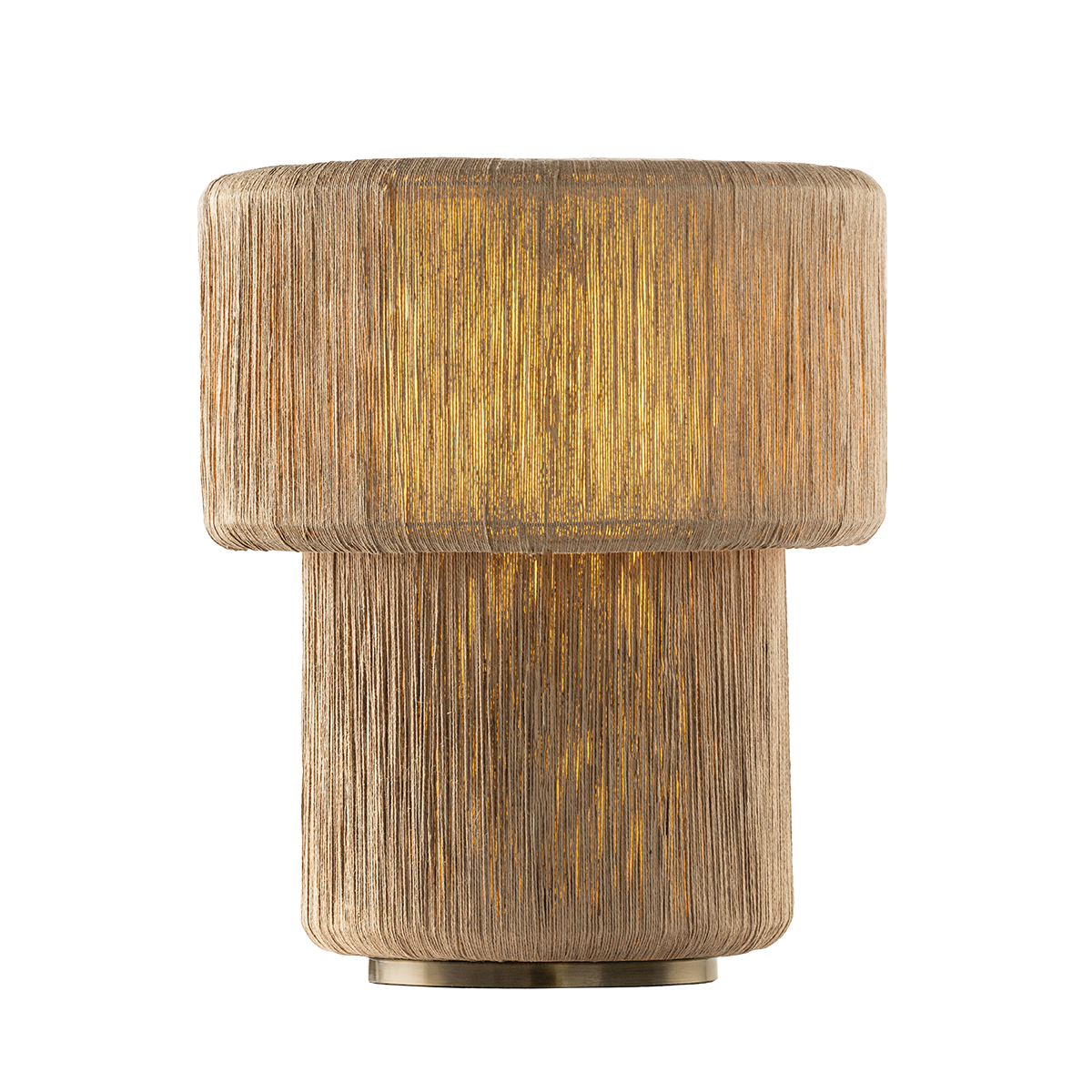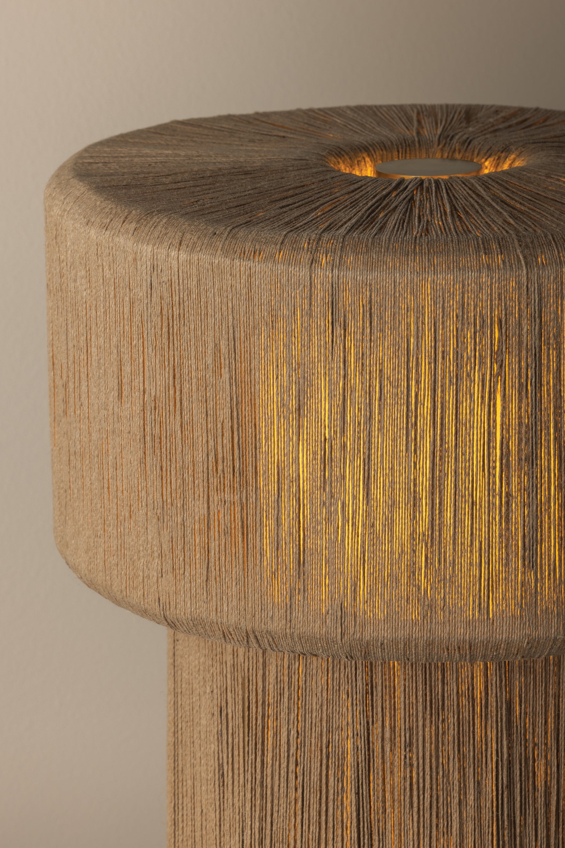 A textural statement piece, the Kenai table lamp features bold proportions and an intricate all-over string construction. Despite the overall petite scale of the silhouette, the wide base and shade create a grounded sense of weight. Dynamic and tactile, the dyed Jute cord strings let light seep through the fixture, emitting a luminous glow to fill a space. Patina Brass-finished hardware hides within the earthy frame.