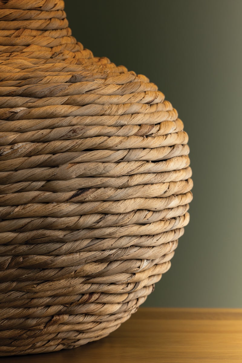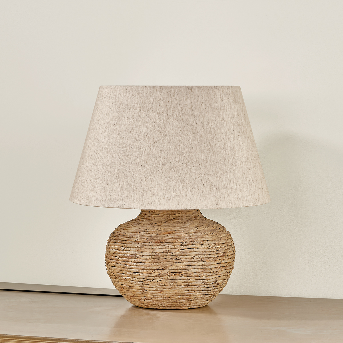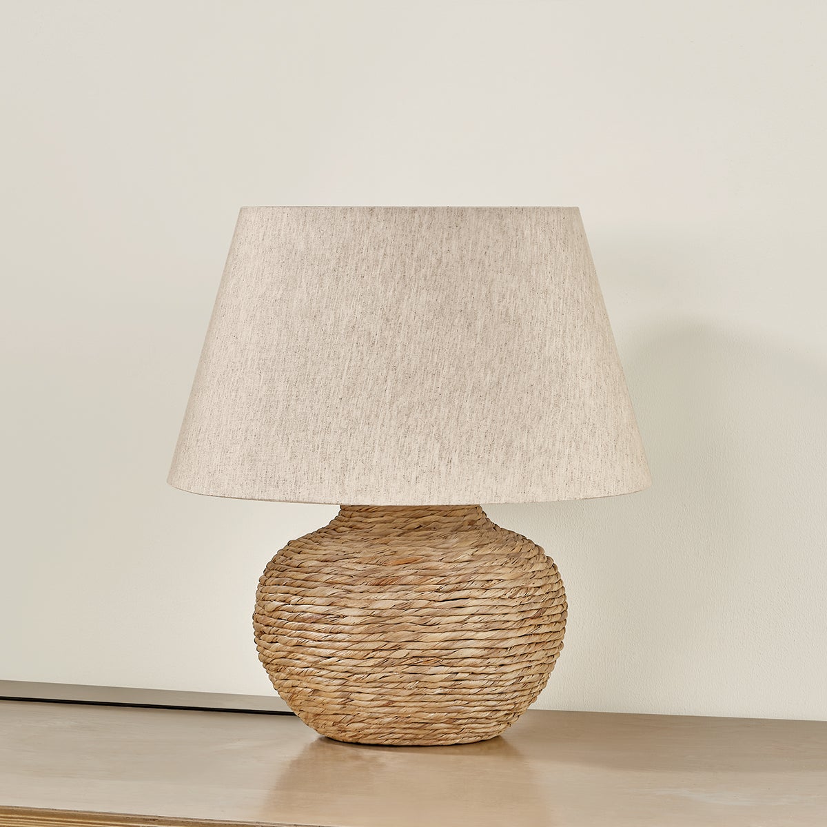 Inspired by traditional basket-making techniques, the construction of the Malik table lamp swells into a voluminous and artistic base shape. Crafted from the stems of natural water hyacinth, its heathered tones and coiled weave highlight the material’s rich tactility. Concealed Patina Brass-finished hardware continues the lamp’s warmth, while a natural linen shade completes the design with a fresh, organic touch.