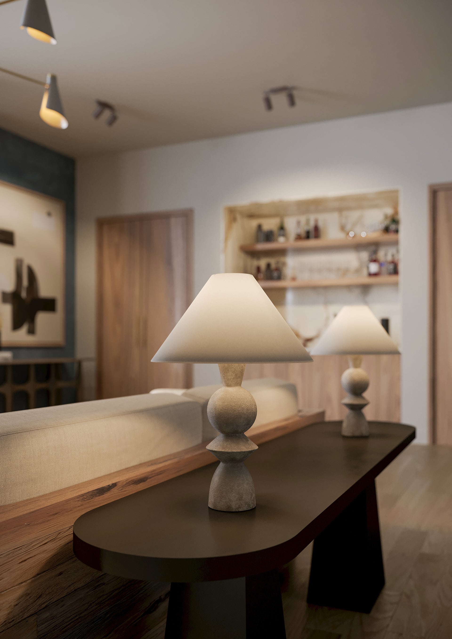 The totemic composition of the Cyrah lamp marries geometry and a stone-like finish to create a striking stack of shapes. Adding a matte surface texture and muted hue, the lunar grey glaze gives Cyrah an ancient, earthy look. Tapping into the trend of dusty, non-glossy ceramics, this lamp makes an artful statement on a side table or bedside.