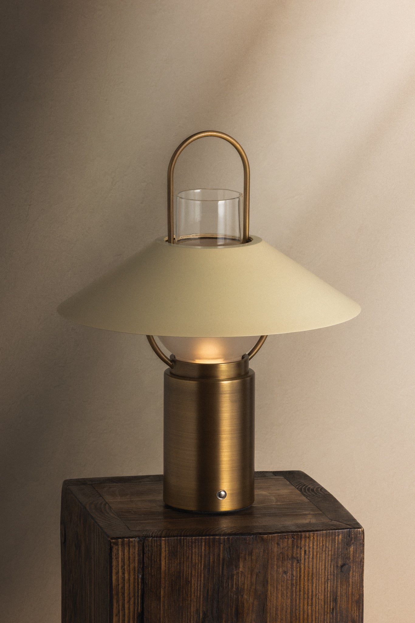 Designed for life in motion, Kindle is a versatile rechargeable lamp with a vintage-inspired silhouette. A Soft Sand shade, etched clear glass, and Patina Brass details lend a warm, artisanal prescence, while the carry handle adds function and charm. At 14.5" high, it's perfectly sized to move effortlessly from room to garden—bringing light wherever it's needed most.