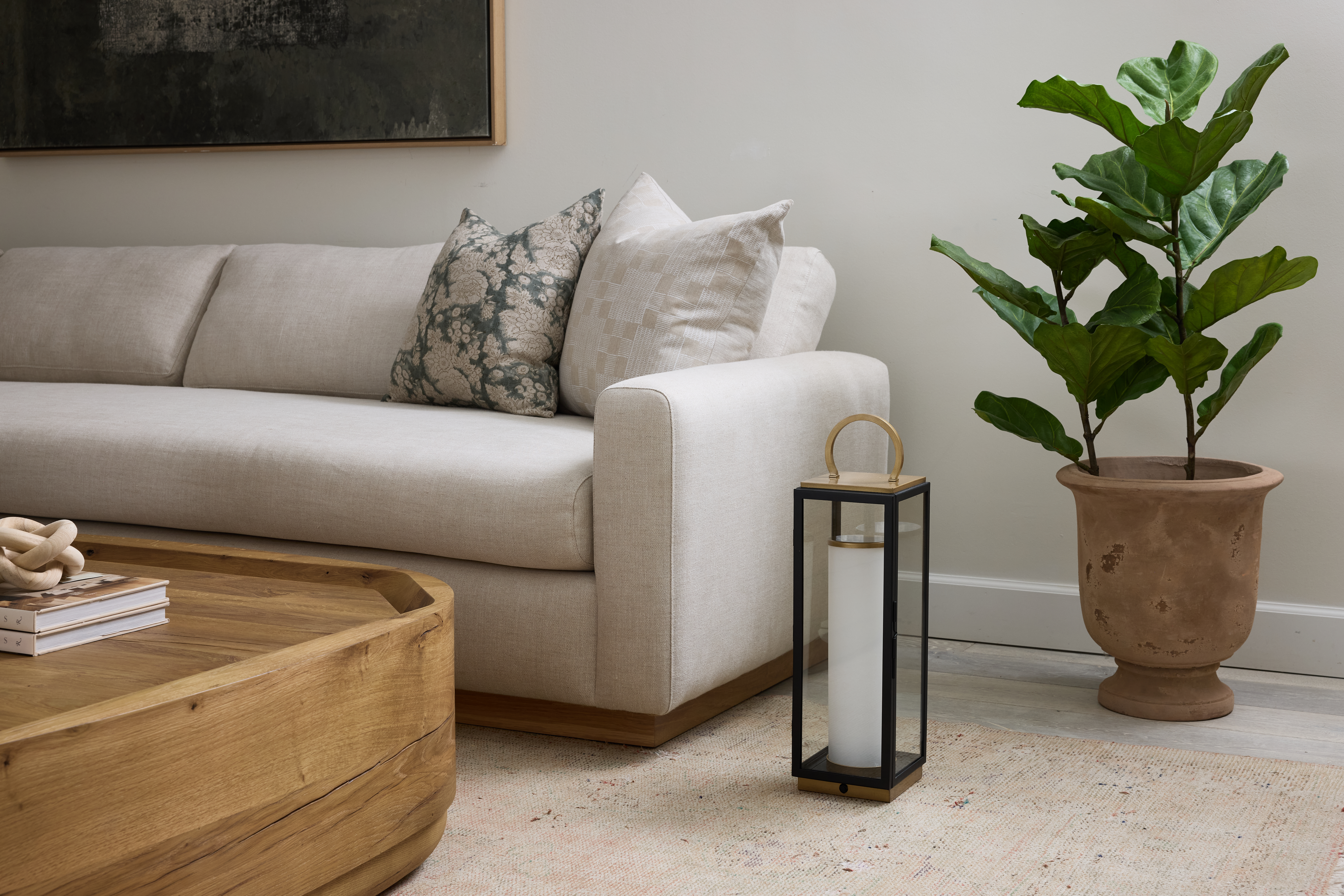 Drawing inspiration from traditional lanterns, this family of sleek exterior fixtures includes sconce and a portable lantern in multiple sizes. Elongated silhouettes and a mixed-finish combination of Textured Black and Patina Brass give these lanterns a contemporary update. While Gareth is equipped with a single chunky pillar candle for a timeless look, the light source is actually a lightweight aluminum puck with LED technology housed the bottom of the glass cylinders. Gareth is available as both a sconce and a portable lantern in multiple sizes. The portable option is rechargeable and includes a convenient handle for easy transport.