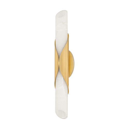 Embodying easy elegance, Camilla explores the relationship between natural stone and sleek metal. A translucent alabaster tube is wrapped by timeless Vintage Brass forms that resemble leaves. Paying homage to nature through both materiality and form, this sconce emanates serenity from within.