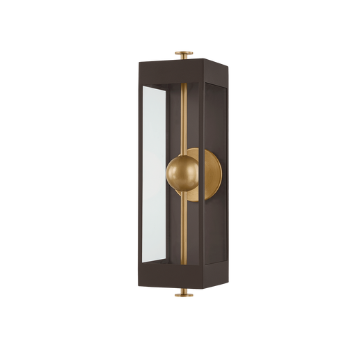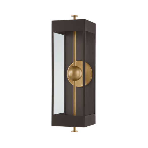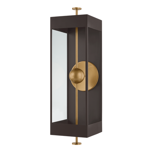 The Garvey sconce reimagines a traditional box lantern with a modern, artistic twist. A rod pierces vertically through the design, suspending a central bead that houses the LED light source. Behind it, a reflective panel amplifies the glow while adding a contemporary dimension. The interplay of the contrasting Textured Bronze and Patina Brass finishes creates visual depth. Available in three sizes.