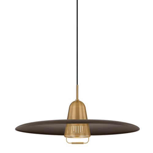 Gilroy reimagines a rise-and-fall pendant design through a mid-century lens. Characterized by crisp lines and balanced proportions, it pairs a shallow shade in a Bronze finish with a contrasting Patina Brass cap that encases the light source. Slender perforations allow light to slip through the shade. Engineered with precision, a knurled handle encourages height adjustment.