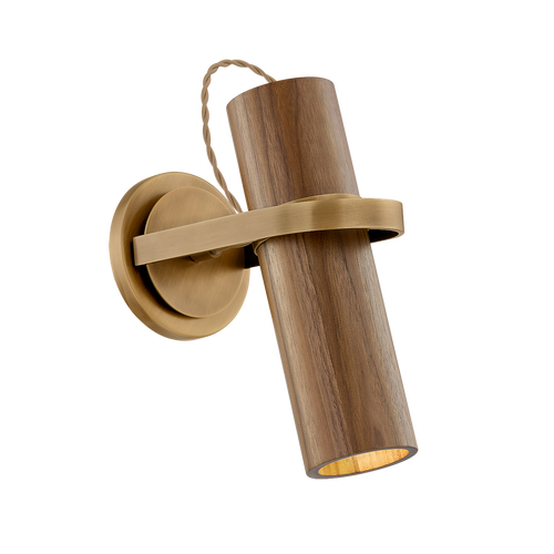 Crafted from walnut wood and Patina Brass, this spotlight sconce combines functional articulation with a natural, handcrafted feel. Its slim, cylindrical head pivots within the U-shaped cuff, which itself rotates at the backplate to provide a complete range of motion. The elevated mix of materials demonstrates that peak utility doesn’t confine aesthetics.