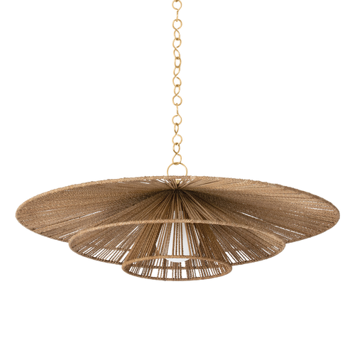 Three shades of wrapped natural Abaca Cord are nested into one another in the dramatic Leven, creating a layered and voluminous silhouette. A thick Vintage Gold Leaf chain suspends the fixture, adding a contrast to the natural materials. Available in two sizes, this distinctive pendant levitates overhead with a captivating glow.