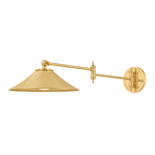Old meets new in the swing-arm Lithgow sconce. This wall-mounted, antique-inspired design brings a timeless elegance to book nooks and bedsides. Finished in Aged Brass, the metal frame includes a swivel for more precise directional lighting. Thanks to efficient LED lamping, the shade is wide and shallow, providing a generous wash of light as Lithgow extends from the wall.