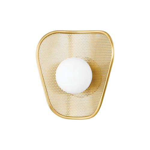 A modern take on vintage silhouettes, Marta is a striking conversation piece. The graphic composition of this sconce includes a curved perforated metal form finished in Aged Brass. Rippled edges create a shell-like shape, while the opal shiny glass orb at the center resembles a pearl. This fun accent light is perfect for any space.