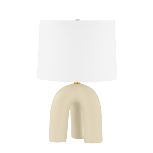 Charming and fun, Mills Pond reminds us not to take things so seriously. Three oversized tubular shapes form the tripod-like base of this delightful table lamp. A white linen shade in a similar size and shape to the base provides a soft light and a sense of balance. The aged brass finish paired with the satin ivory base adds just the right amount of subtle sophistication.