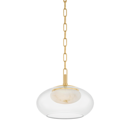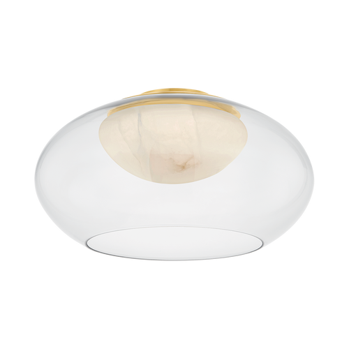 Moore stuns in its simplicity. Available in two sizes, this nested flush mount design features an outer clear glass shade that reveals alabaster within. The double layer gives the fixture an elevated, graceful presence that creates a warm diffusion of light. Finished in Aged Brass, the metalwork of Moore adds a timeless, luxurious note that complements any design style.