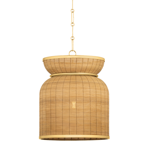Handcrafted in India, the basket-inspired weave of the Parkchester pendant highlights the special qualities of natural rattan. Adding a note of shine to the construction, an Aged Brass band cinches the fixture at the top, coordinating with the chunky chain suspension. Available in two sizes, Parkchester filters the light to beautiful effect.