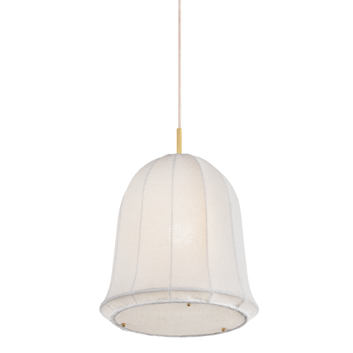The Risa pendant nods to Neoclassical motifs with its sweeping arches and flutes, yet its materiality is rooted in the present. The scalloped shaping of the silhouette occurs naturally, as the sheer woven cotton fabric stretches across the pendant’s delicate metal framework. With glimmers of Aged Brass peeking through the weave, Risa strikes a softly architectural balance between the organic and luxe.