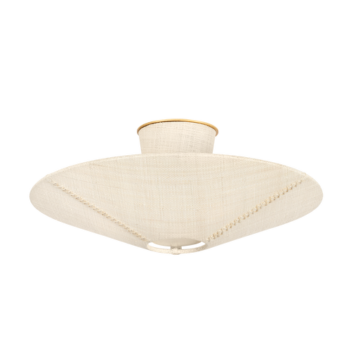 Salisbury Mills tells a natural material story that adds instant freshness to a coastal or bohemian space. Woven from Saguran Fabric, the shade serves as a gentle diffuser. The canopy and lower plate of this artisanal semi flush mount are finished in Gold Leaf, adding a luxe note.